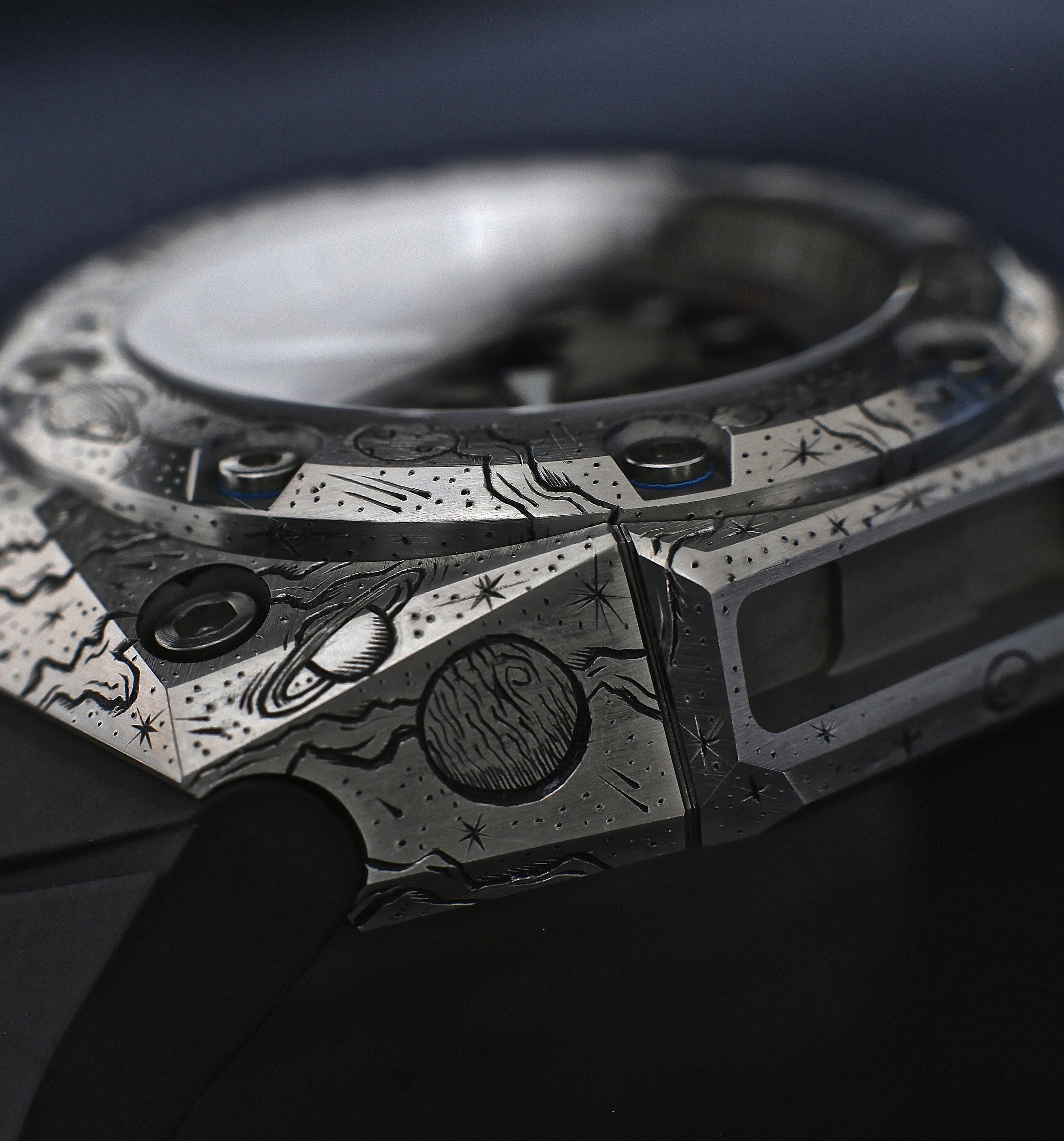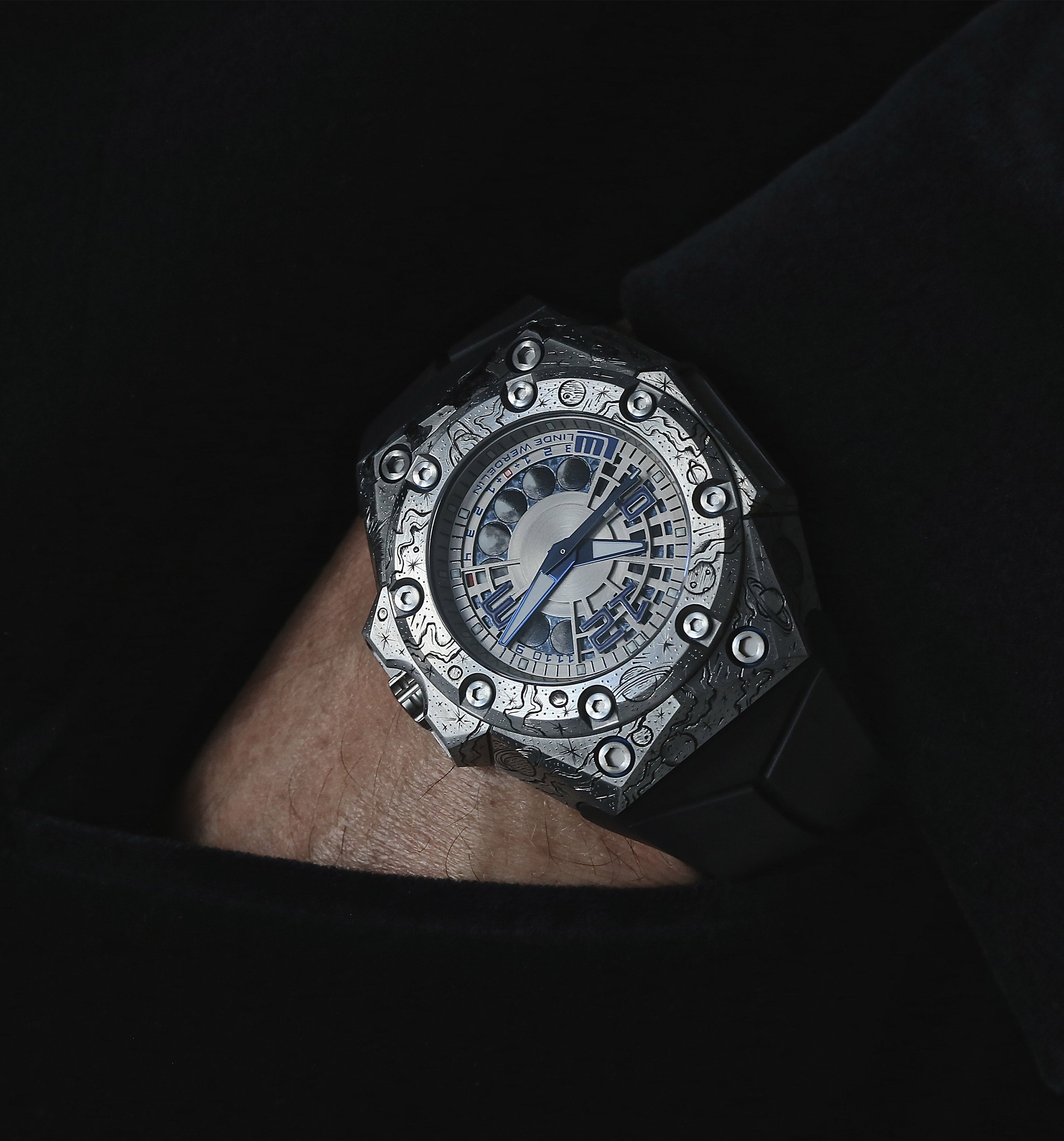This timepiece is the second collaboration with master engraver Johnny Dowell. As with the Oktopus Reef that Dowell worked on, this new project saw him take an existing Linde Werdelin piece and transform it with a full-case engraving. While the Oktopus Reef depicted an underwater scene, the Oktopus Crazy Universe looked up for inspiration, getting lost amongst the stars.