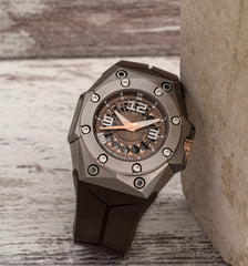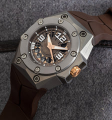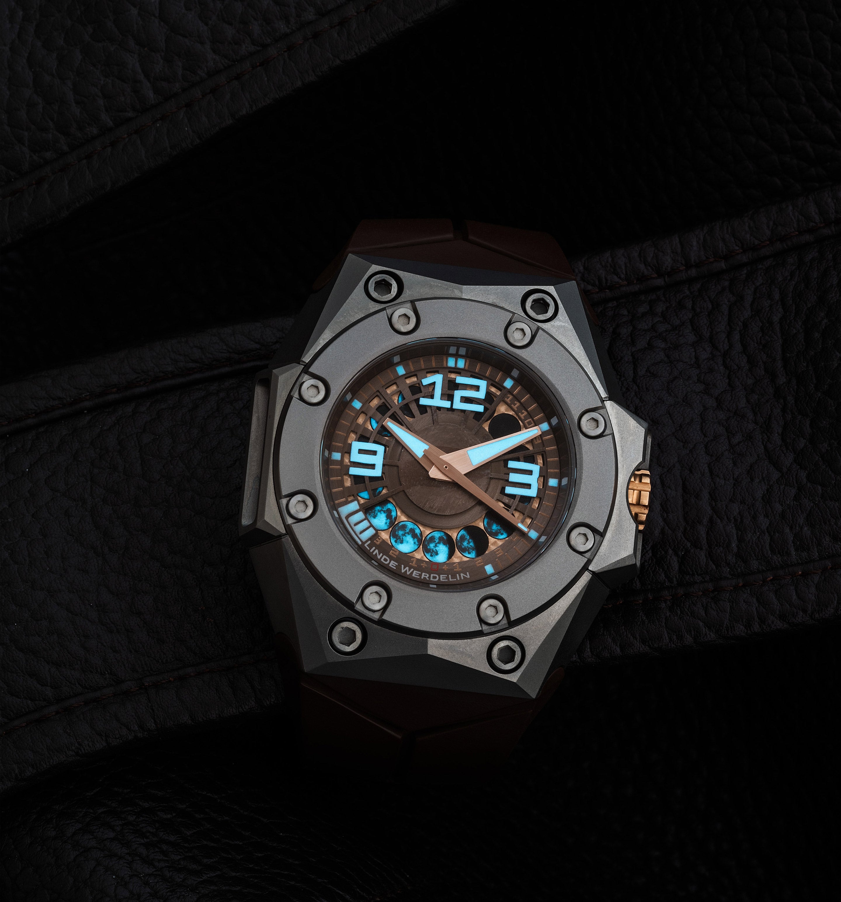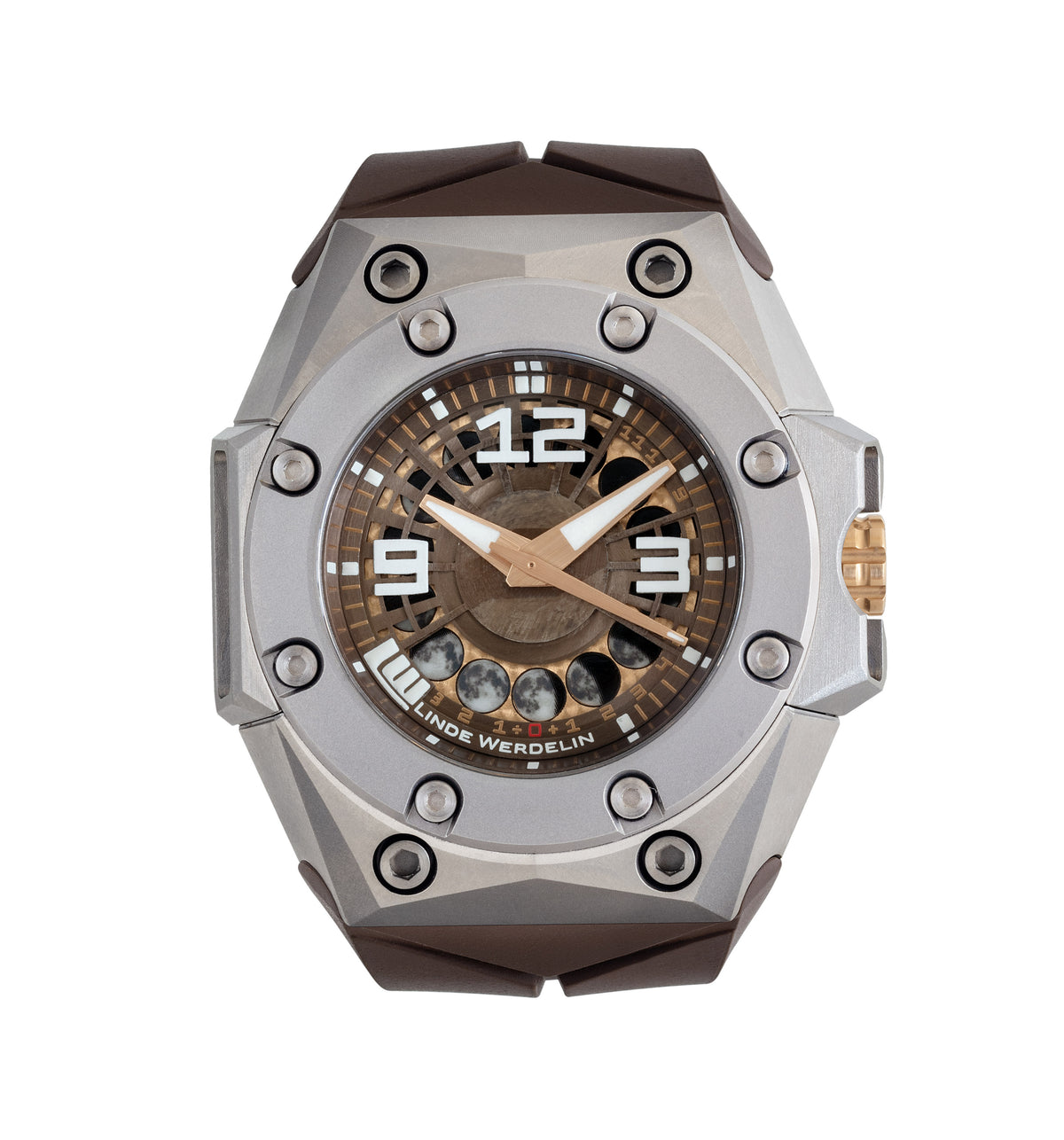 In a seasonal interpretation of the highly technical Oktopus family, made for divers and created for the Danish navy special forces, the Oktopus Moon features a five-layer skeletonised dial in bronze and gold satin finish hands.