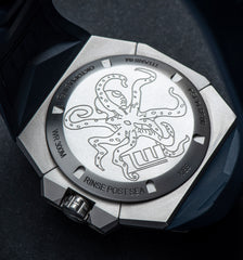 5 part case-construction in grade 2 titanium, 2.5 mm anti reflective sapphire crystal, Titanium grade 2 screw in back case with engraved octopus drawing, Black tension disks, Microbillé finished