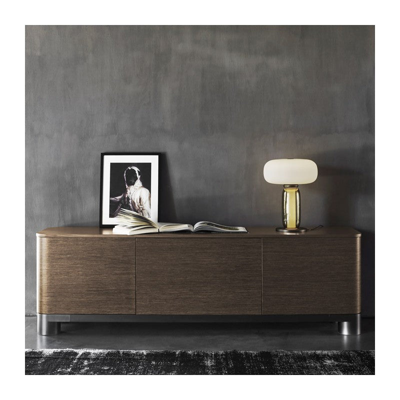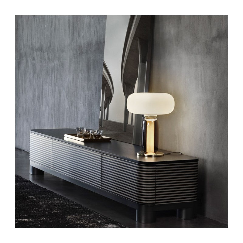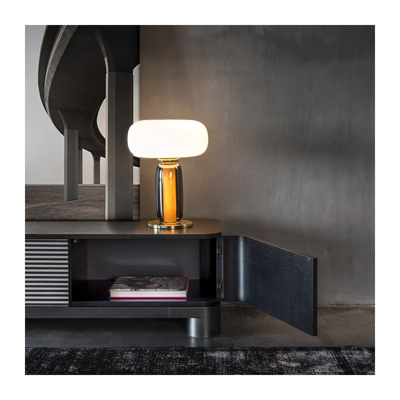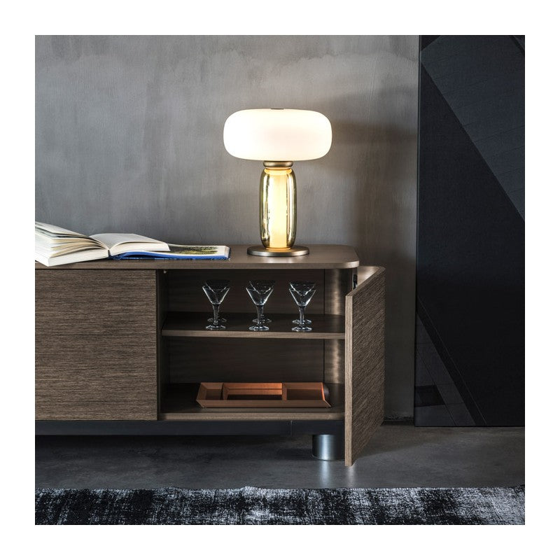 The One on One is composed by two blown glass elements, with the lower being metalized and housing an internal glass cylinder to give a sculptural effect to the light source.