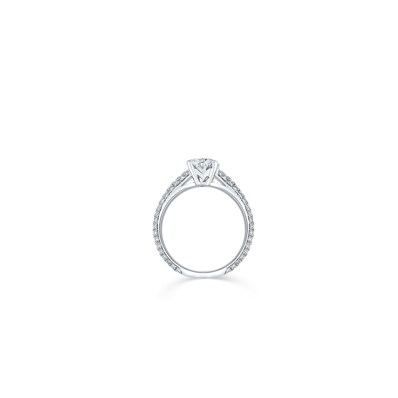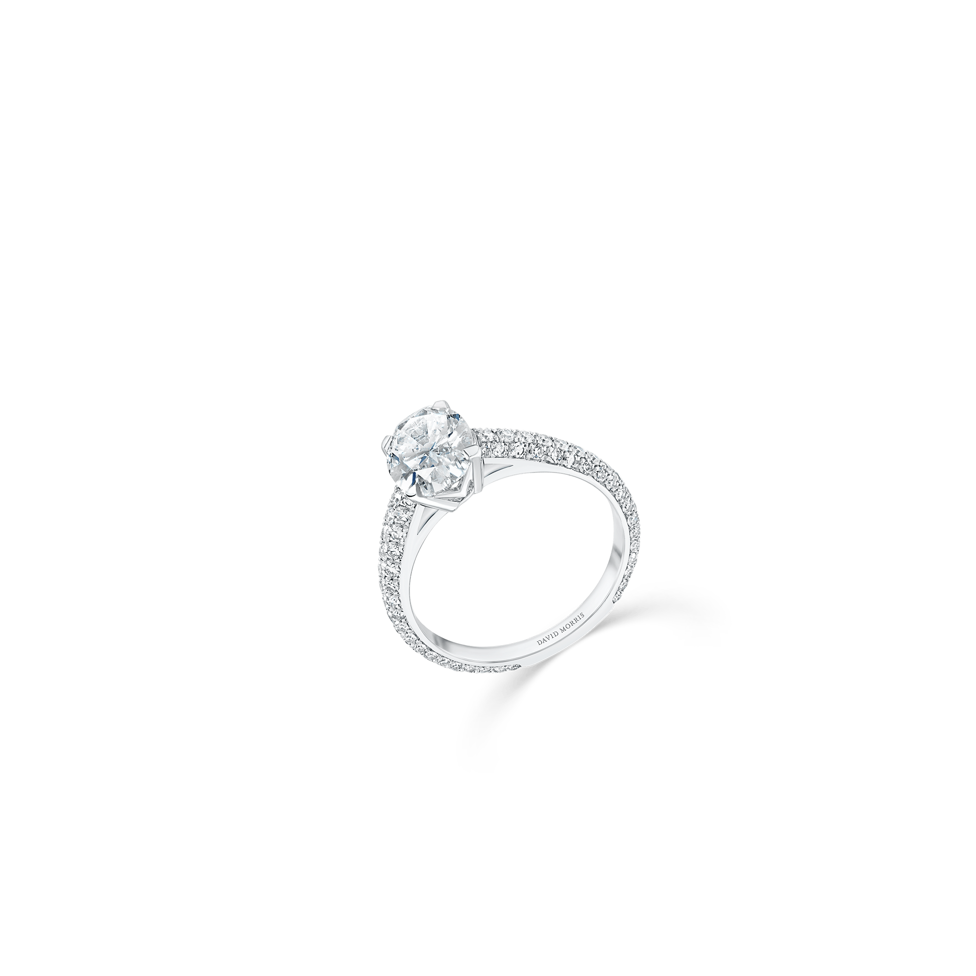 Oval white diamond engagement ring with skinny pavé diamond band, set in 18ct white gold.