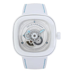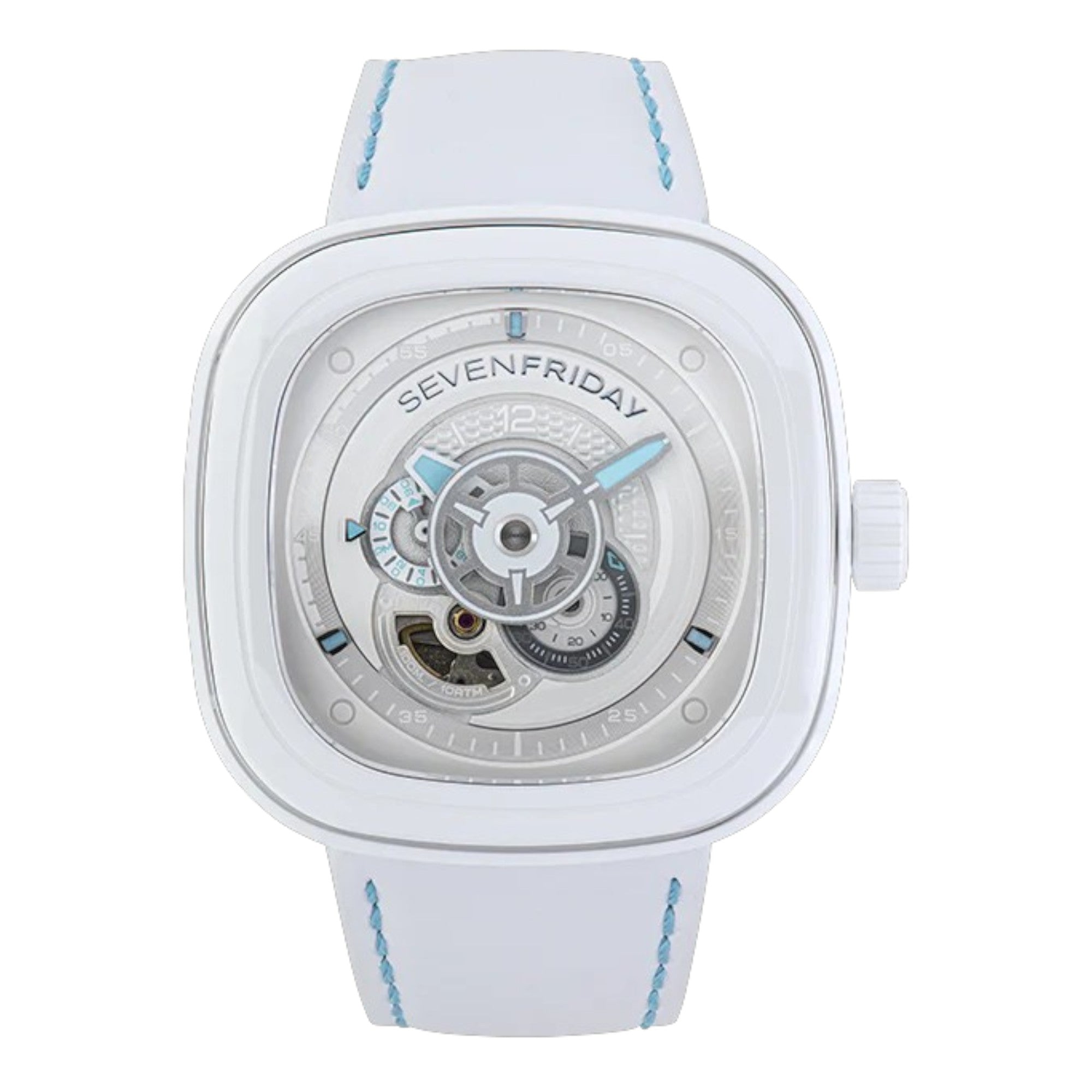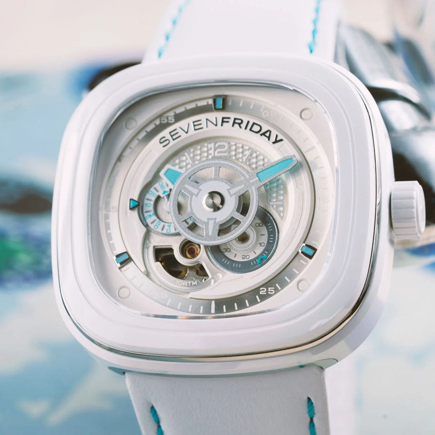The inspiration behind this piece, the Mexican drink Curaçao, is evident through the incorporation of luminous blue in the hands and dial. The drink might not be to everyone’s taste but the P1C/05 sure is. This contrast between clean whites and vibrant hues of blue makes this piece the picture of summer. The only thing keeping you from taking the Curaçao for a seaside spin might be the white padded genuine calfskin leather with contrasting blue stitching.