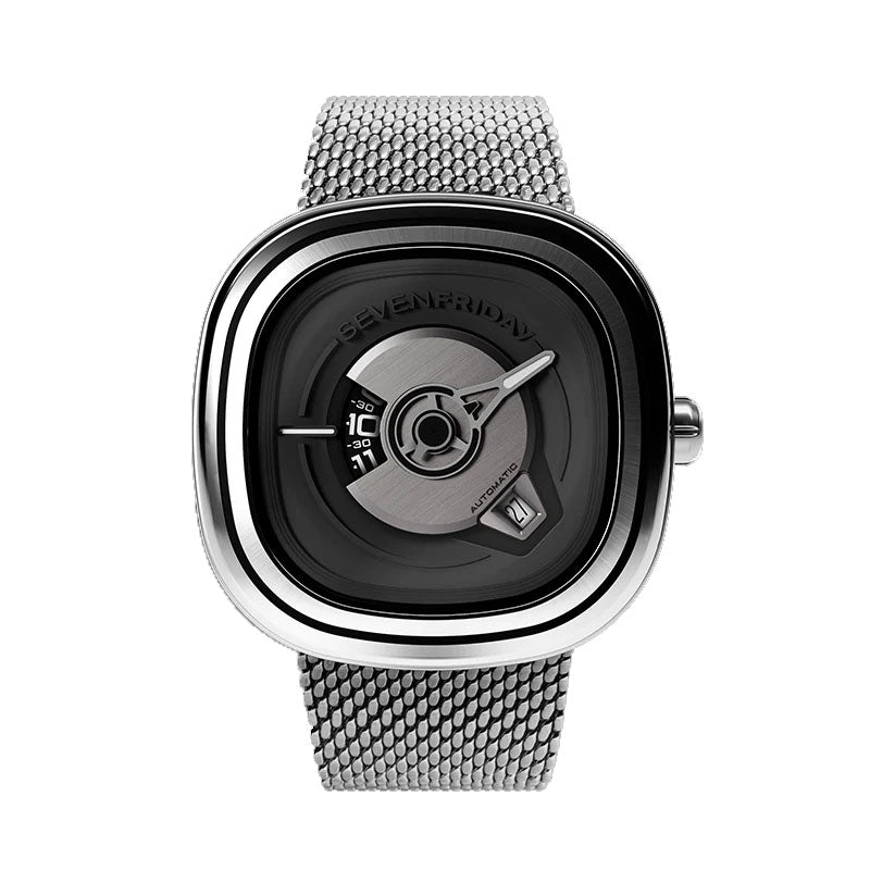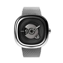 Caseback: Polished and sunray brushed caseback. Watch in connection with the SEVENFRIDAY App (iOS & Android), thanks to an NFC chip embedded in the caseback, allows secured authentication and registration