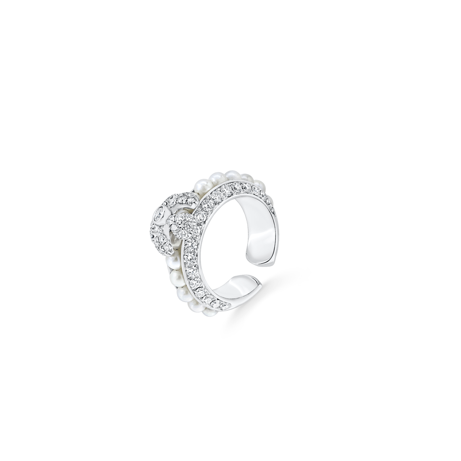 Pearl Rose Flower Single Row Ring with pearls and white diamonds set in 18ct white gold.
