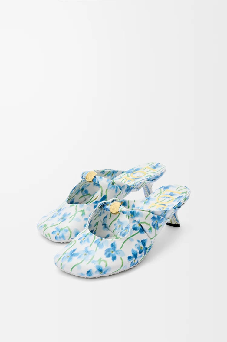 Mule in supple floral print nappa lambskin with a flexible upper engineered for extra comfort, featuring an Anagram Pebble and a signature petal toe shape.