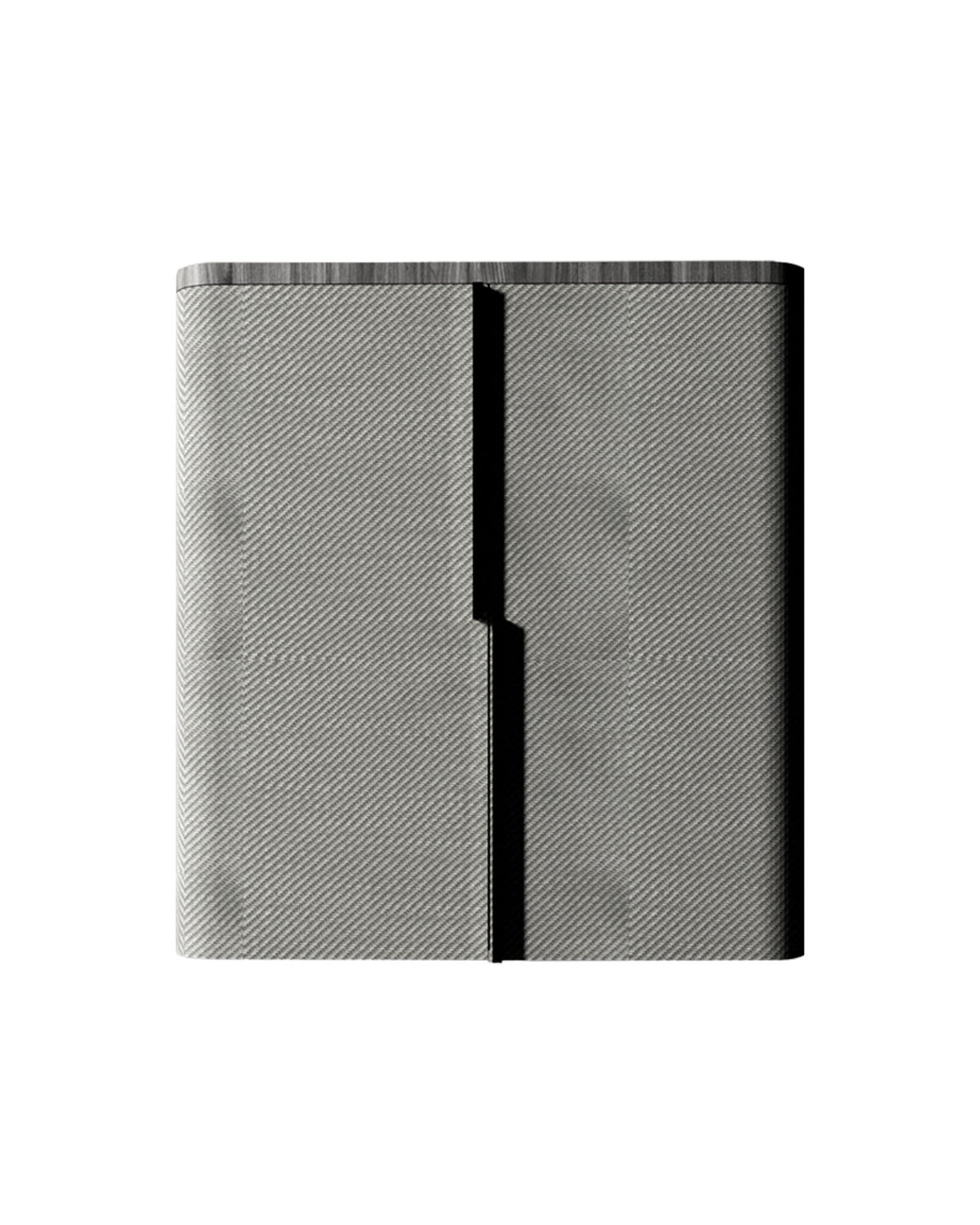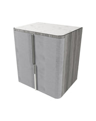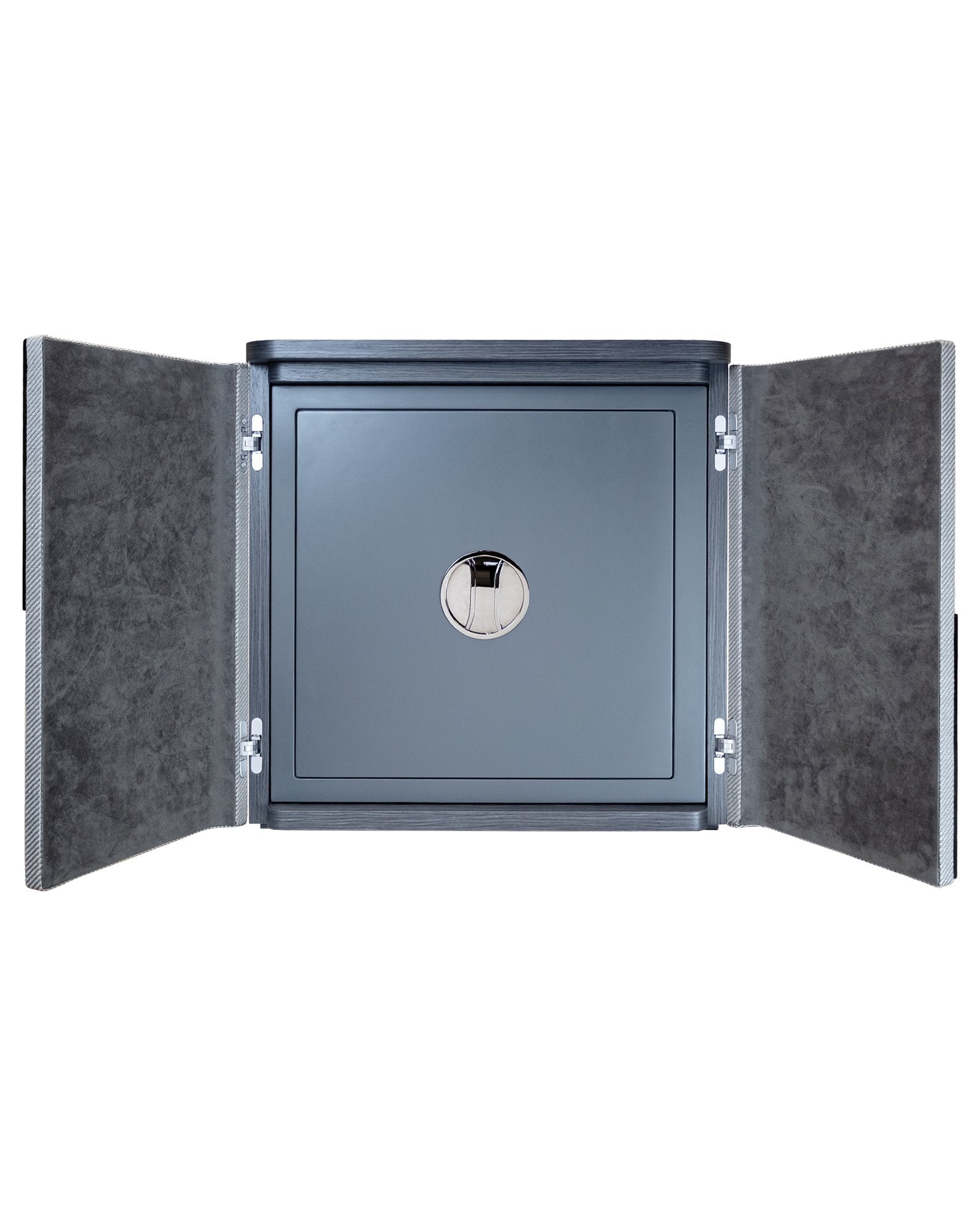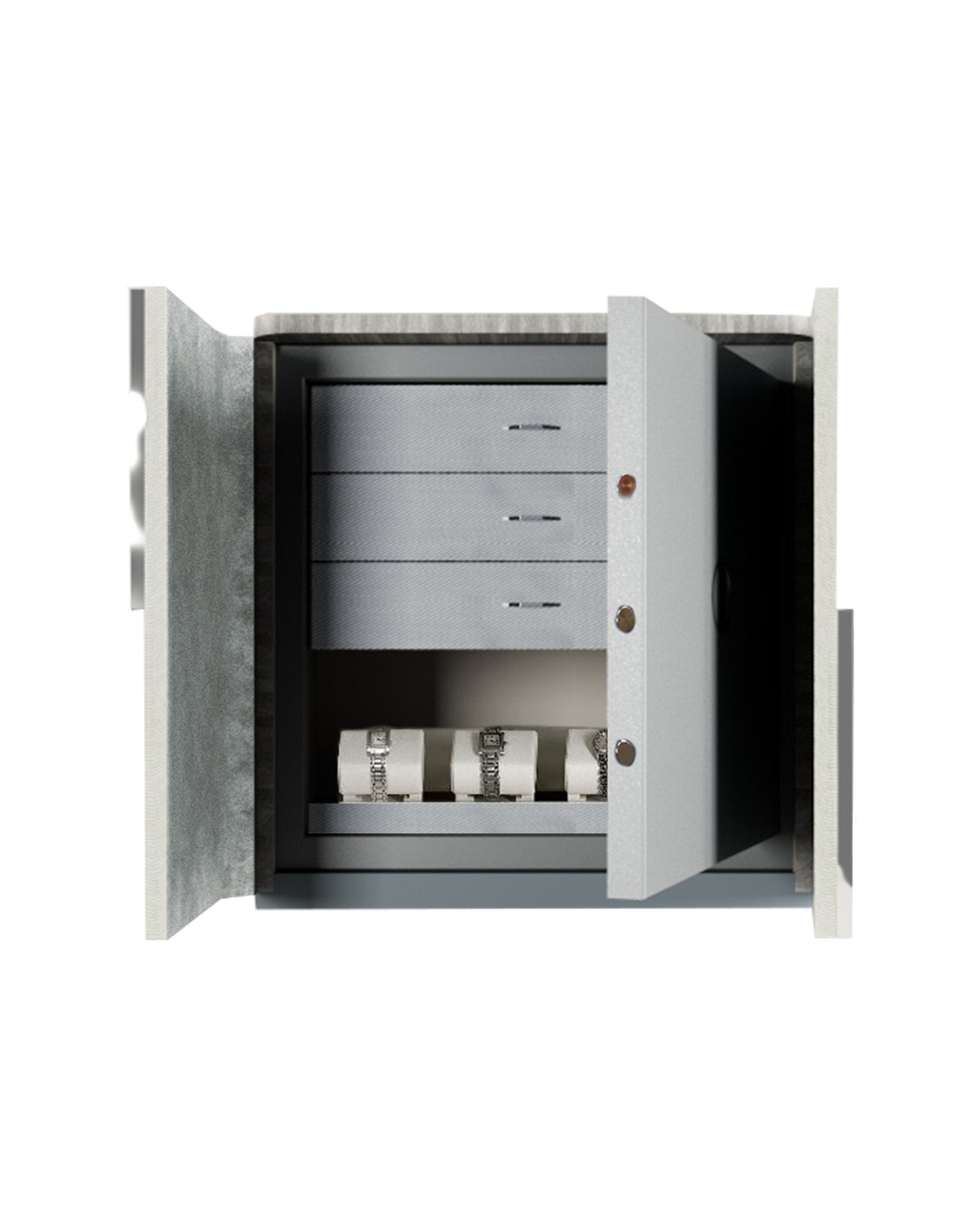 Armored jewelry chest in fine matte grey oak, with a white marble top that evokes both refinement and solidity. The doors, upholstered in woven fabric, add a touch of elegance, while the round ruthenium handle, featuring biometric access and an emergency key, ensures security and practicality. Inside, a grey matte-painted safe offers discreet storage. Removable trays and jewelry drawers, lined with woven fabric on the front, provide an additional layer of luxury and functionality.