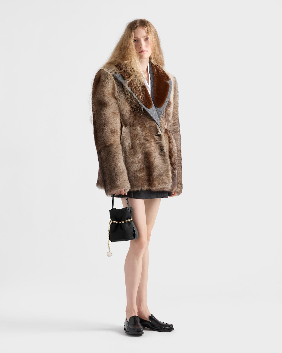 A sophisticated and contemporary identity characterizes this bucket bag with a soft silhouette crafted in Re-Nylon framed by a leather handle. The sleek simplicity of the design dialogues with macro details like the chain with spherical pendant that gives a refined and distinctive character. For sustainable care to preserve the product's characteristics and reduce microfiber shedding, we recommend not washing the item too often. Let the product air out after every use and follow the washing instructions on the label.