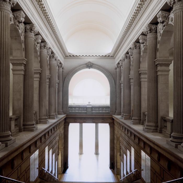 Print 3 interior is a black-and-white photograph detailing the elegant Beaux-Arts architecture of The Met Fifth Avenue facade and Great Hall, which opened to the public in 1902. It was designed by the architect Richard Morris Hunt, who was also a founding trustee of the Museum. The beautifully printed image is elegantly framed in a grey wooden frame with glass.