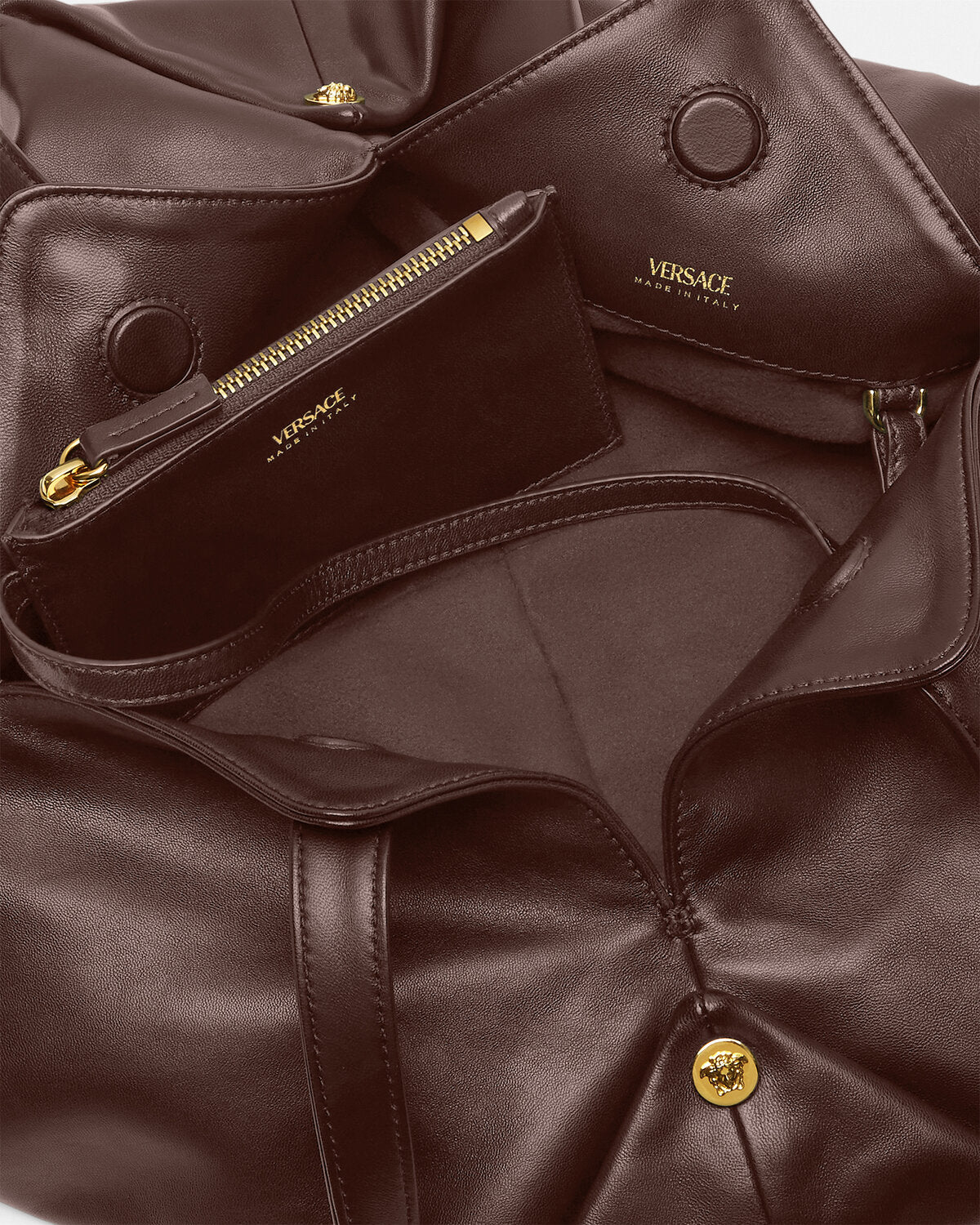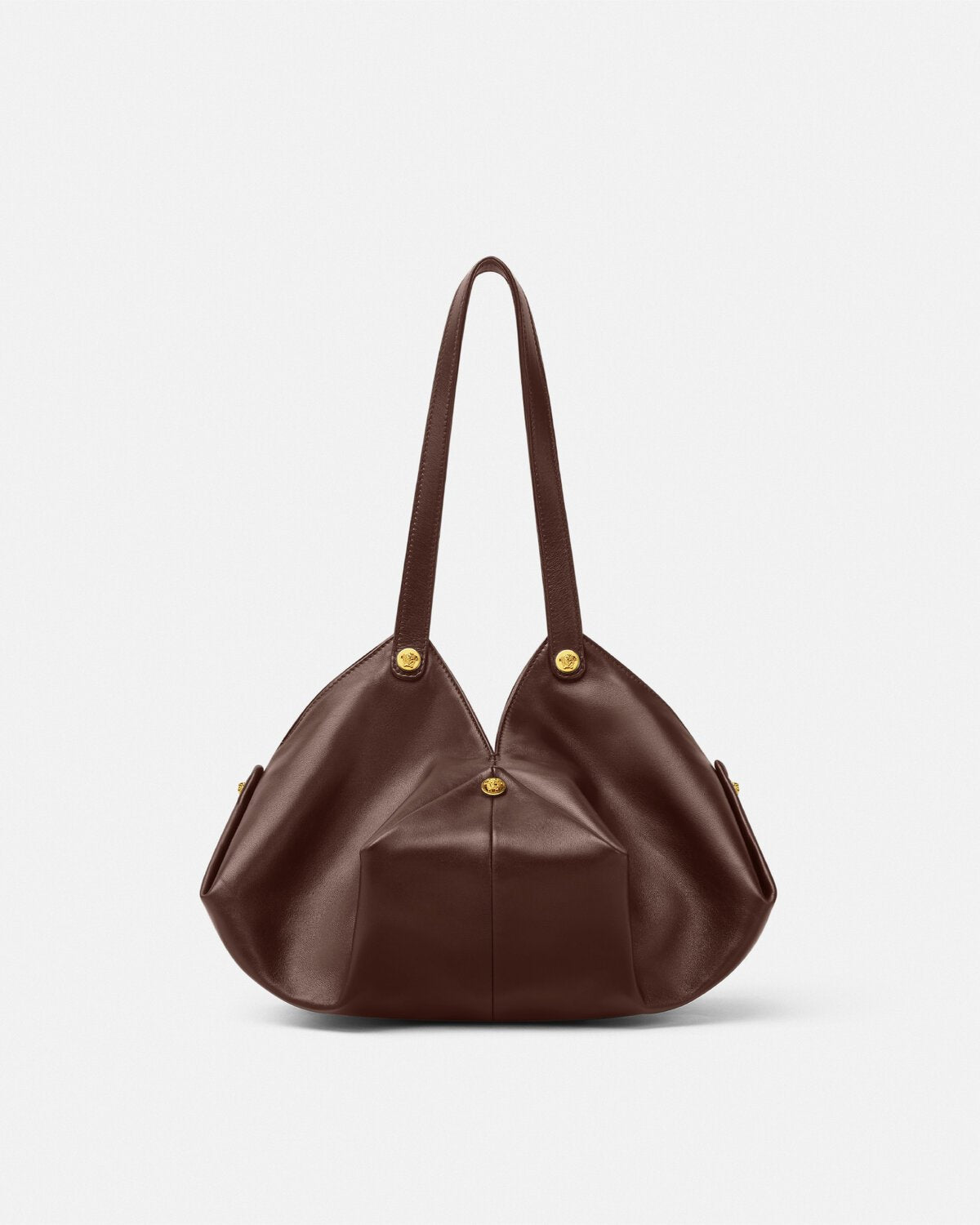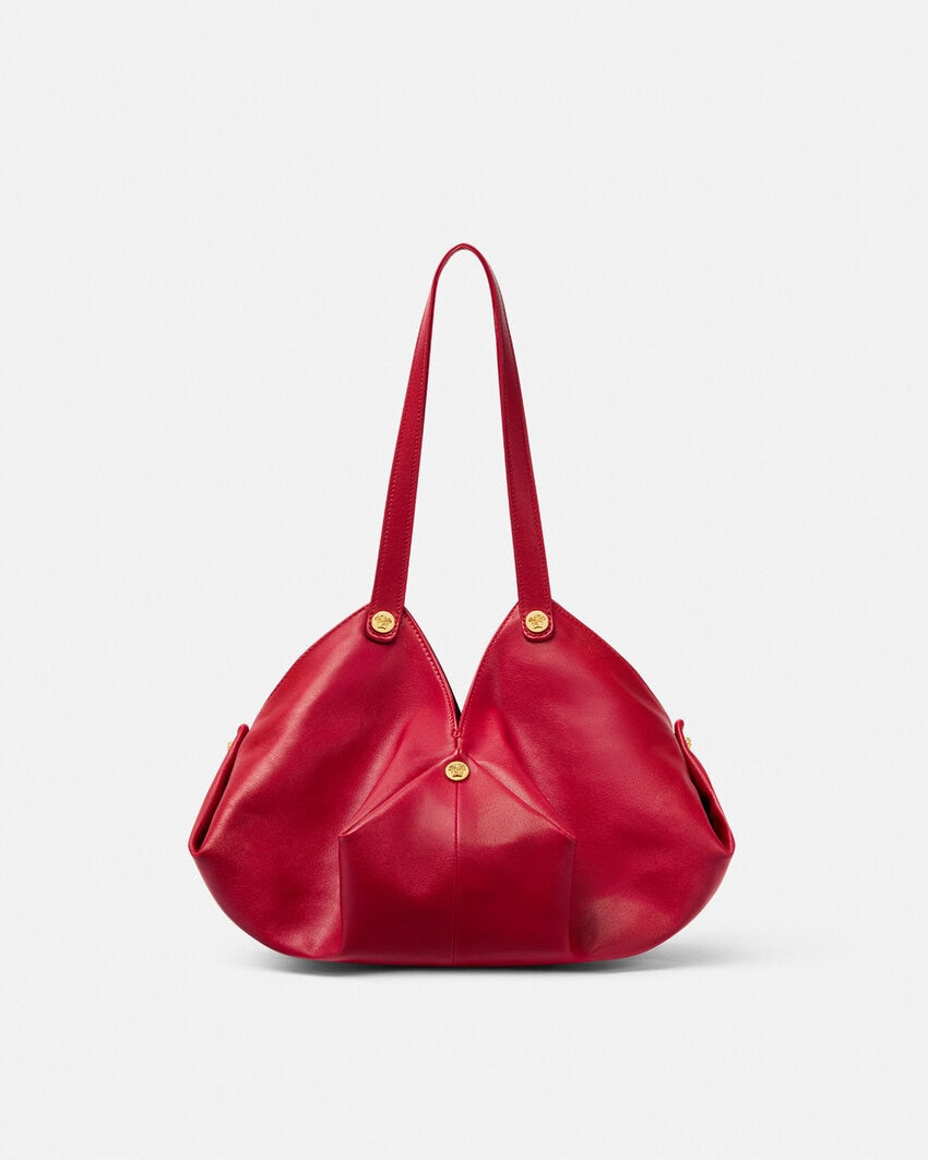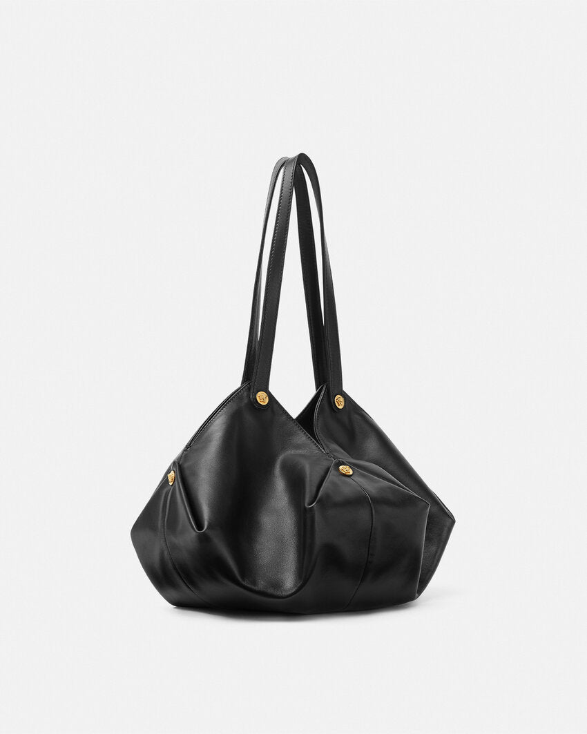 The Protea shoulder bag is crafted from supple plongé nappa leather. Inspired by the changing nature of its namesake tropical flower, it features a unique magnetic fold closure that transforms for added versatility. The spacious design is accented with metal rivets featuring the Medusa emblem at each corner. The circular base is finished with a subtle embossed Medusa.