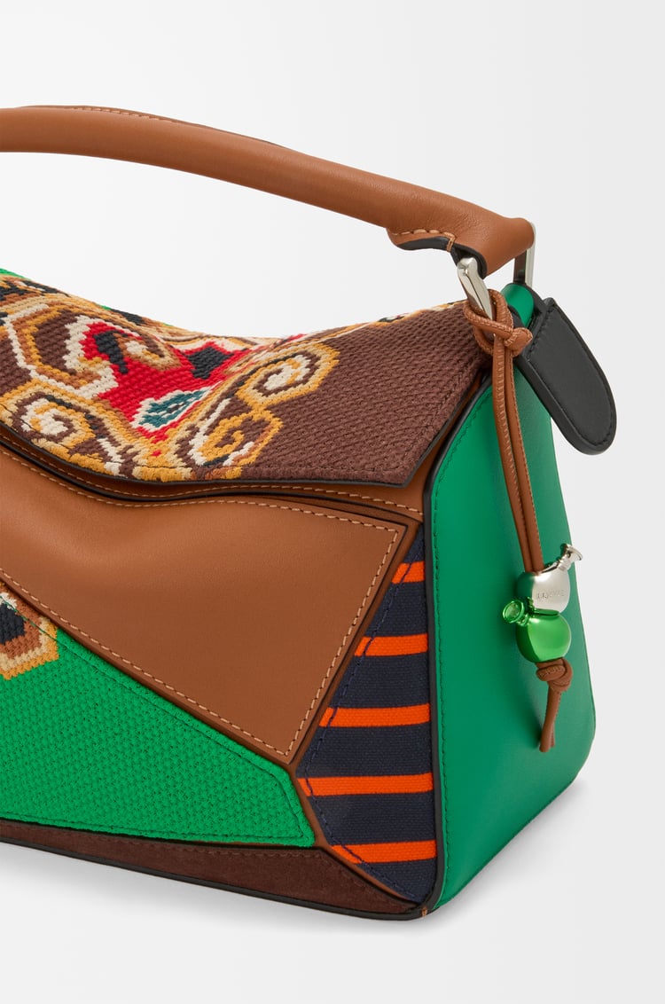 The Puzzle is defined by its distinctive geometric lines and its cuboid form. This small version is a limited 10th Anniversary re-edition of the SS18 Men's pre-collection Puzzle. It is crafted in classic calfskin, suede and striped canvas with cross stitch motifs.