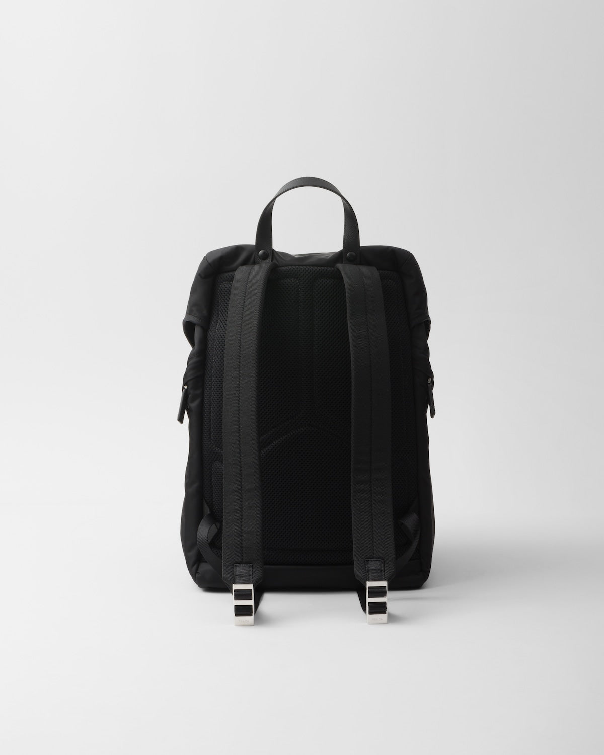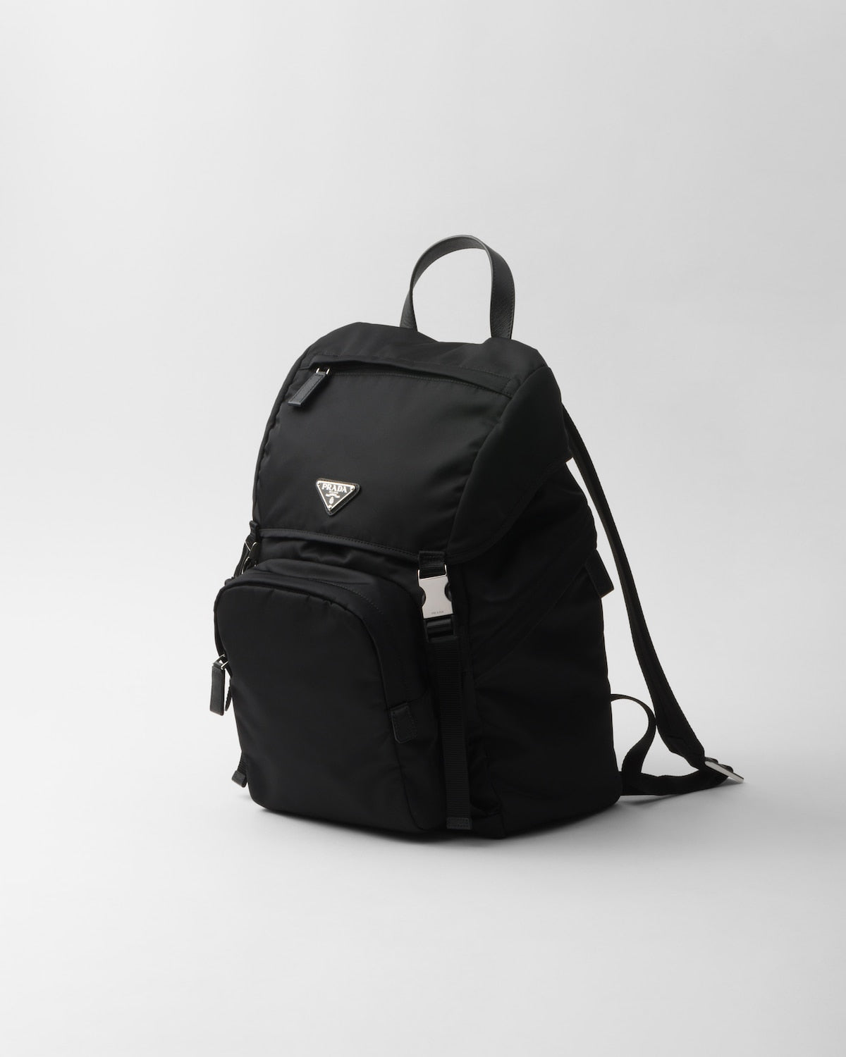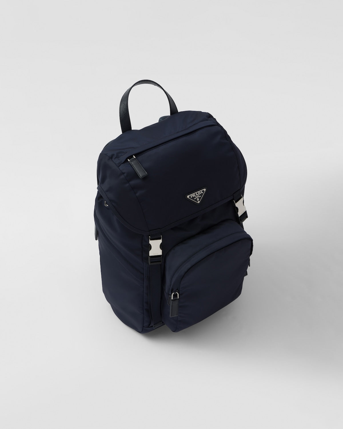 The evolution of an iconic Prada style since the eighties, this nylon backpack is made of Re-Nylon, a regenerated yarn produced from recycled, purified plastic trash collected in the ocean, fishing nets, and textile waste fibers. This technologically innovative fabric is paired with Saffiano leather, an historic material of Prada tradition defined by its crosshatch pattern and waxed finish. The enameled metal triangle logo accents the compact design with flap and oversized front pocket.
