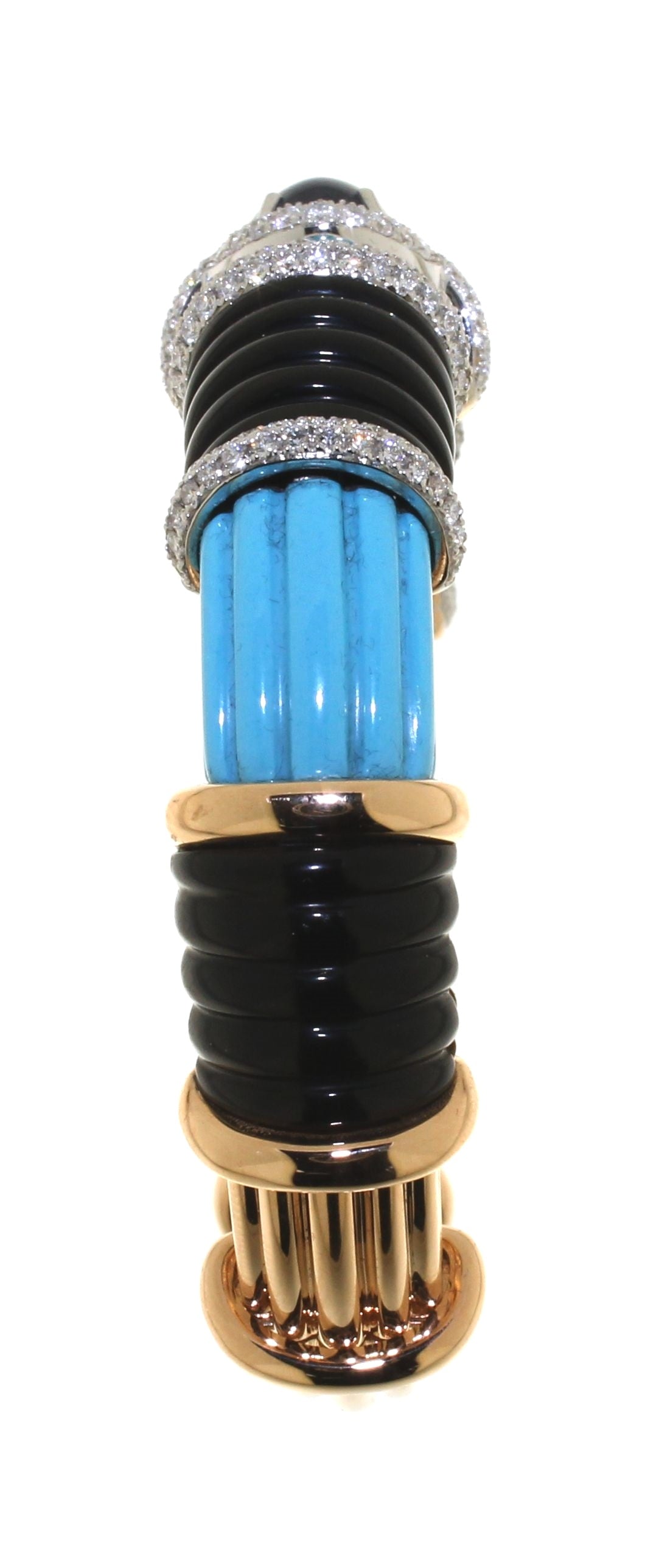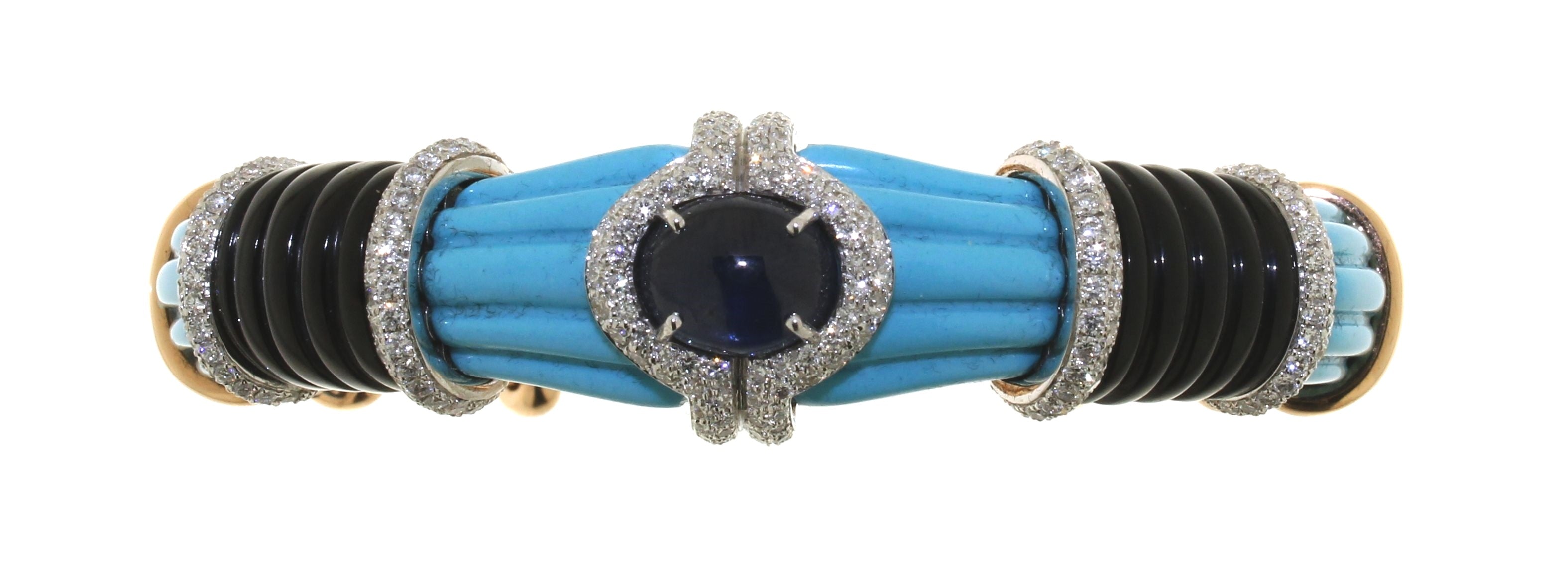 Rose gold bangle with diamonds, turquoise, onyx and blue sapphire cabochon. All our turquoise and onyx are reconstructed and ecological.