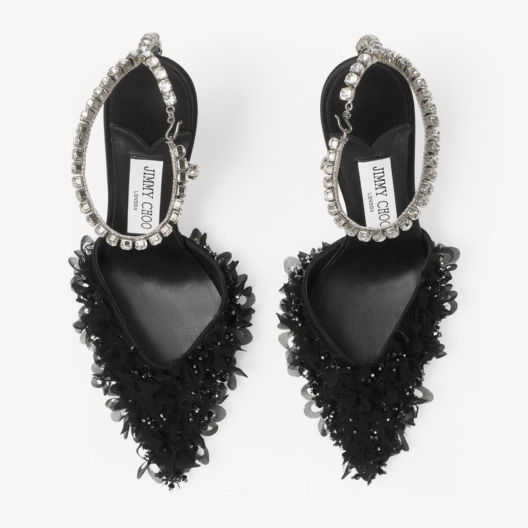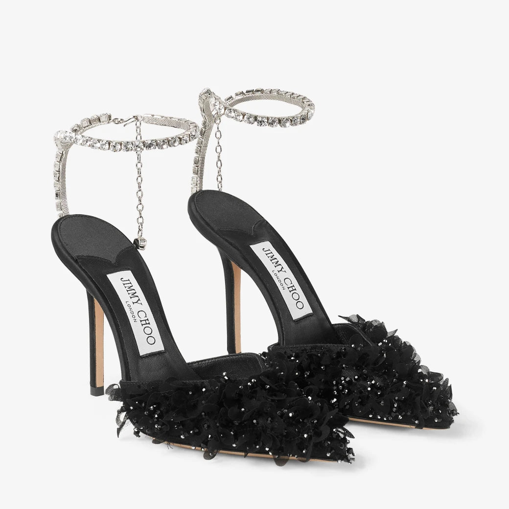 Blurring the line between footwear and jewellery, the iconic Saeda pump in mesh is embellished entirely in delicate petals with light-catching crystal detail. It is made distinct with its delicate crystal anklet. This shining statement features a drop crystal that hangs elegantly at the back of the shoe. The anklet is designed and crafted to sit low on the ankle, effortlessly elongating the leg. Striking and glamorous, this pair is set on a 100mm stiletto heel.