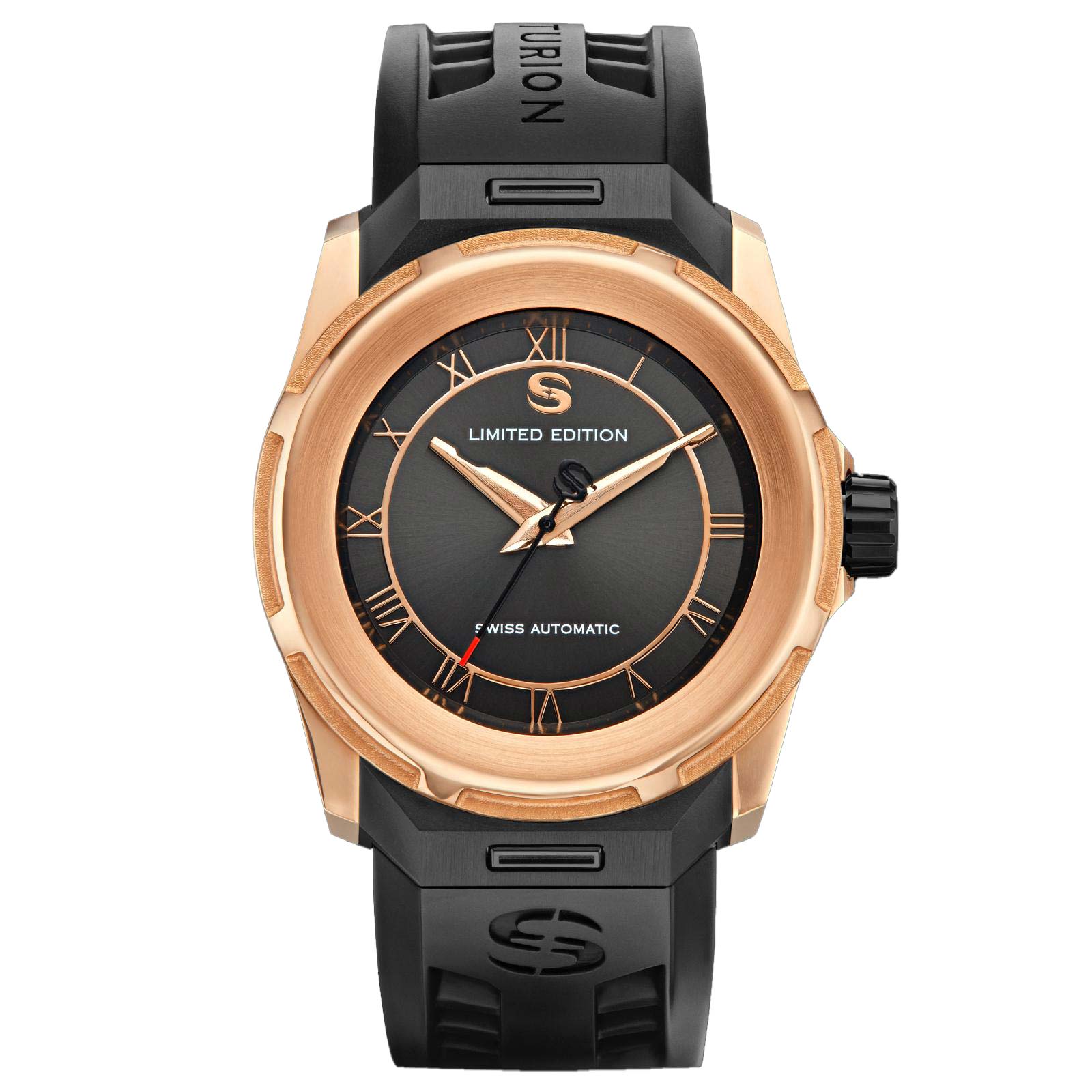 Solid 18K Rose Gold body and bezel cast in a traditional lost wax process with radial brush, polish, sandblast and linear brush finishes applied by master craftsmen. Laser etched PVD billet machined Titanium caseback featuring Senturion S logo and radial brush finish.