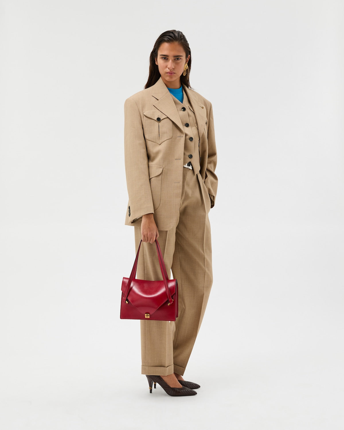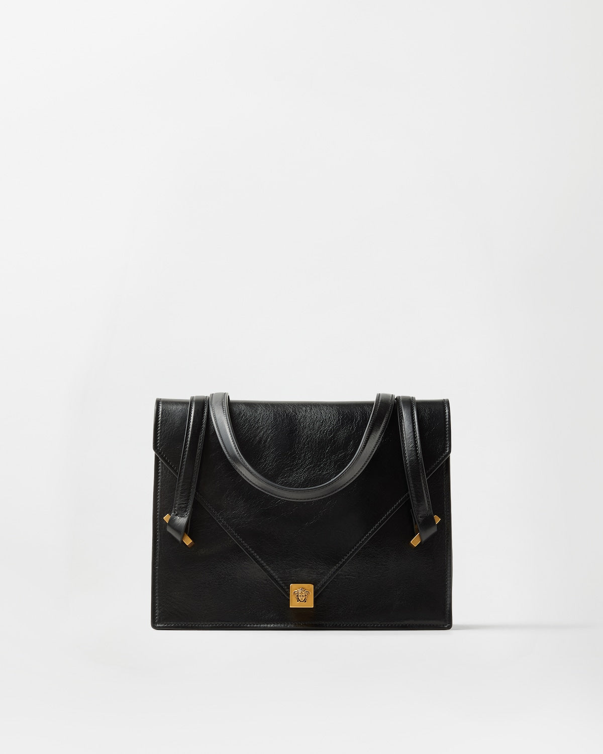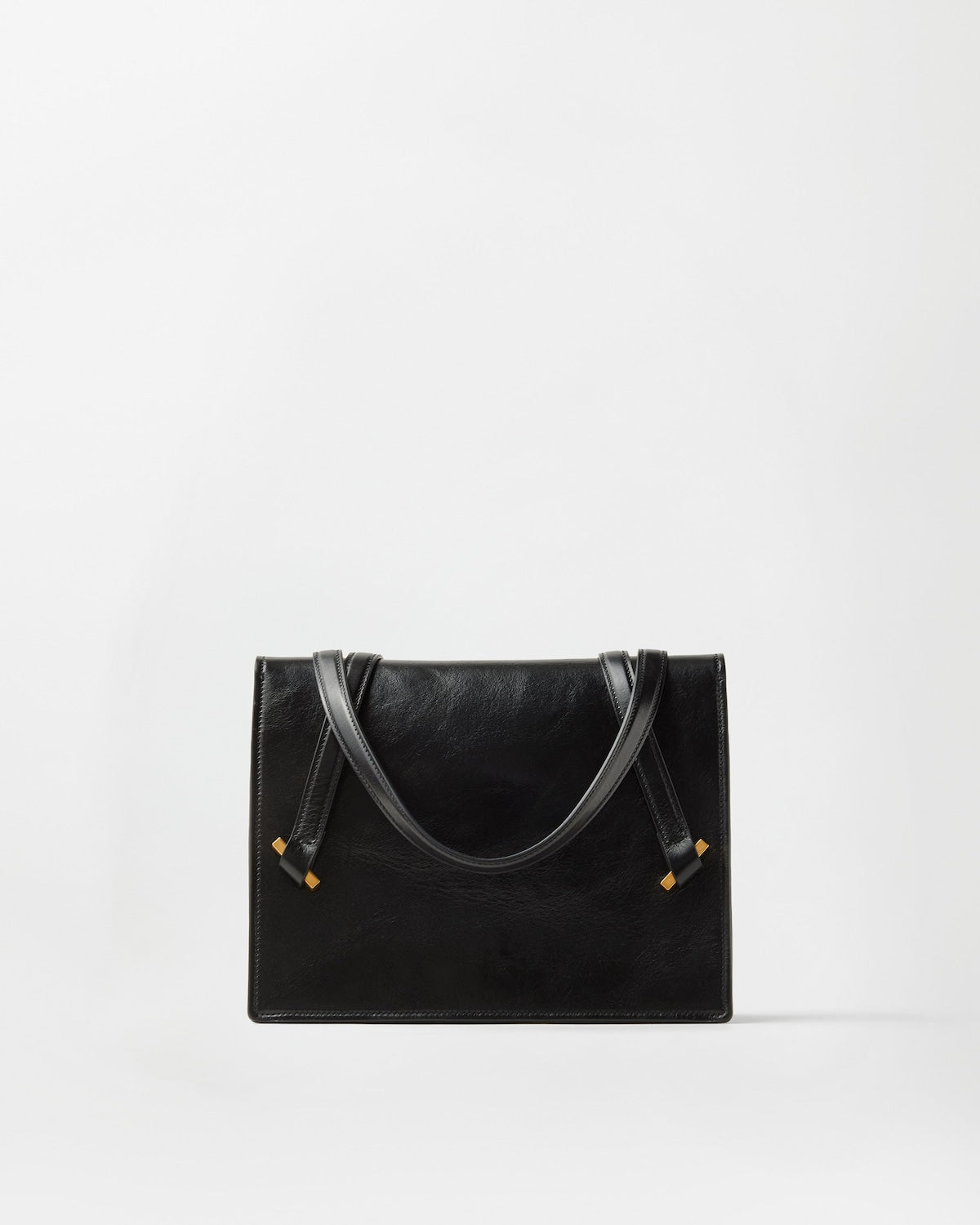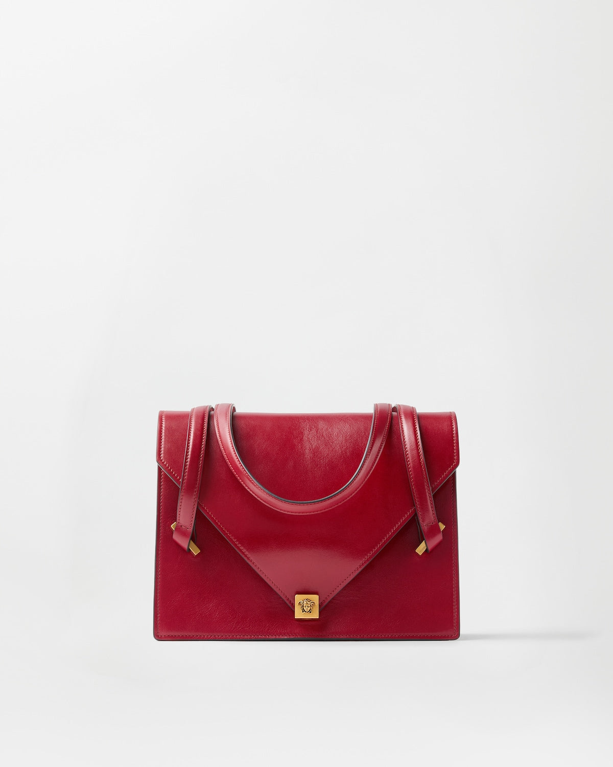 This Severine medium shoulder bag maintains a distinctive structured geometry while being crafted from supple calf leather for a soft feel. It features a squared closure on the front flap, accented with 3D Medusa hardware, and oblique metal inserts at the handle attachments.