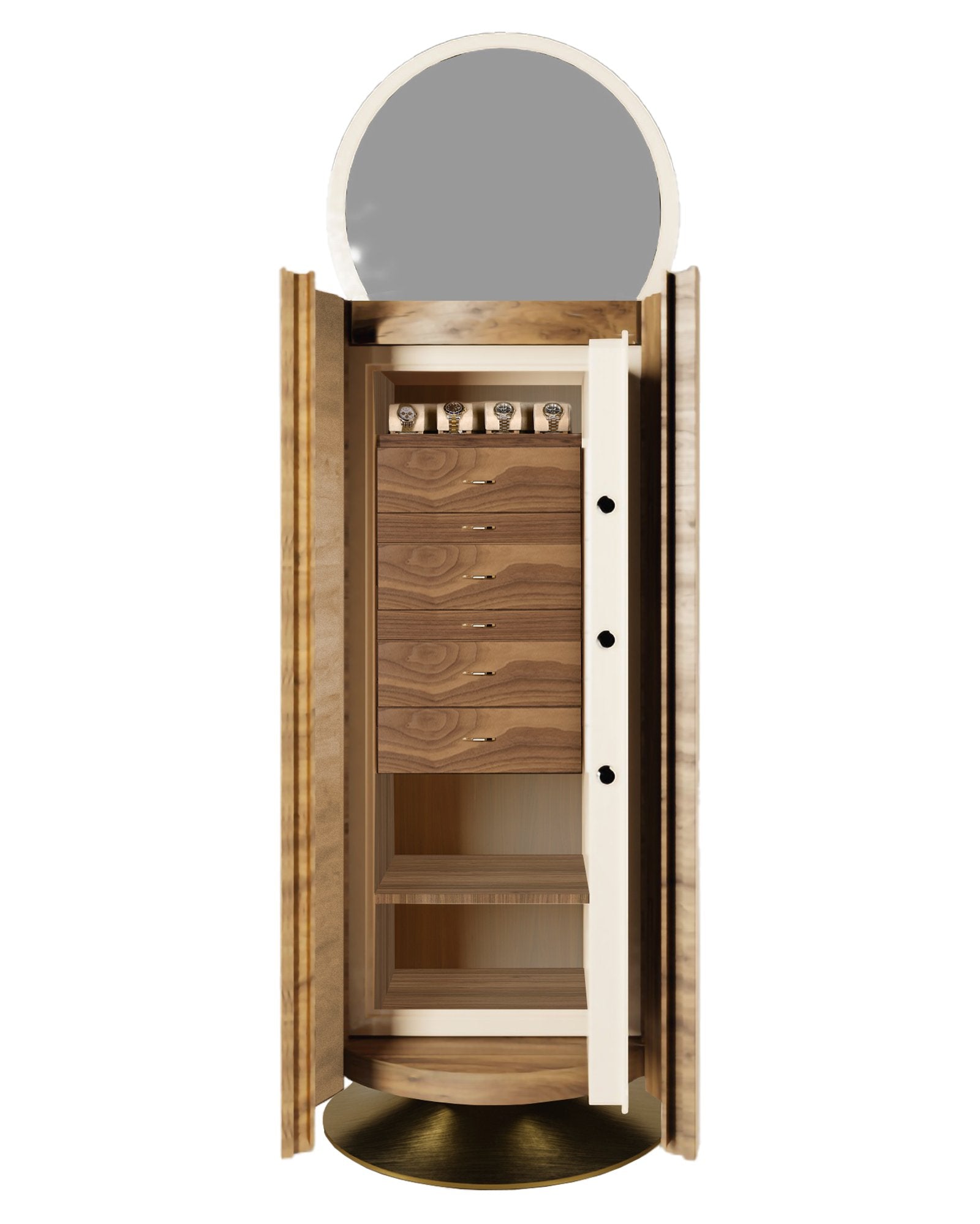 This lockable jewelry chest features a refined curved exterior design, crafted from fine walnut canaletto wood with a matte finish that enhances the natural beauty of the wood. Every detail has been carefully designed to give the chest a sophisticated and luxurious appearance, making it an exclusive piece of furniture.