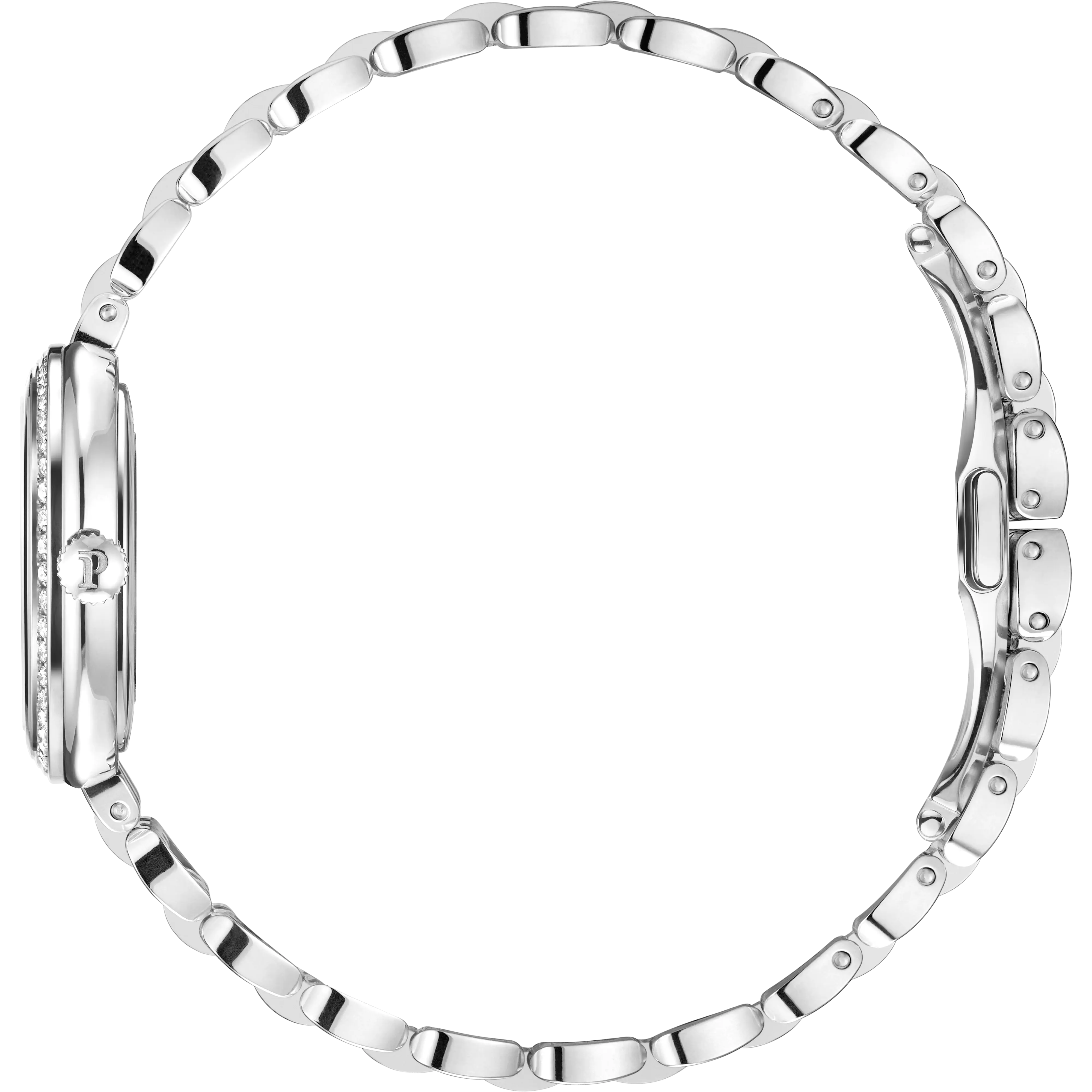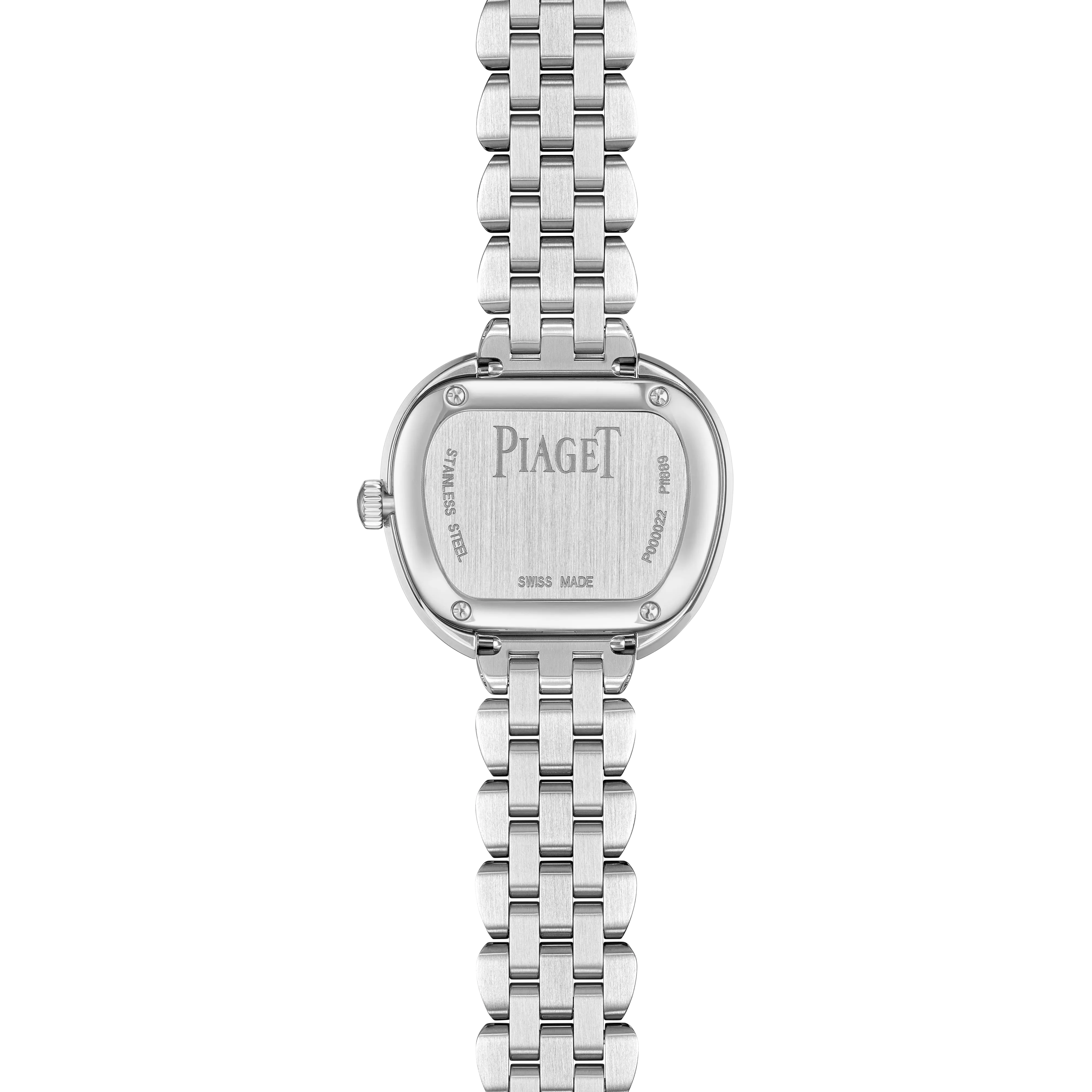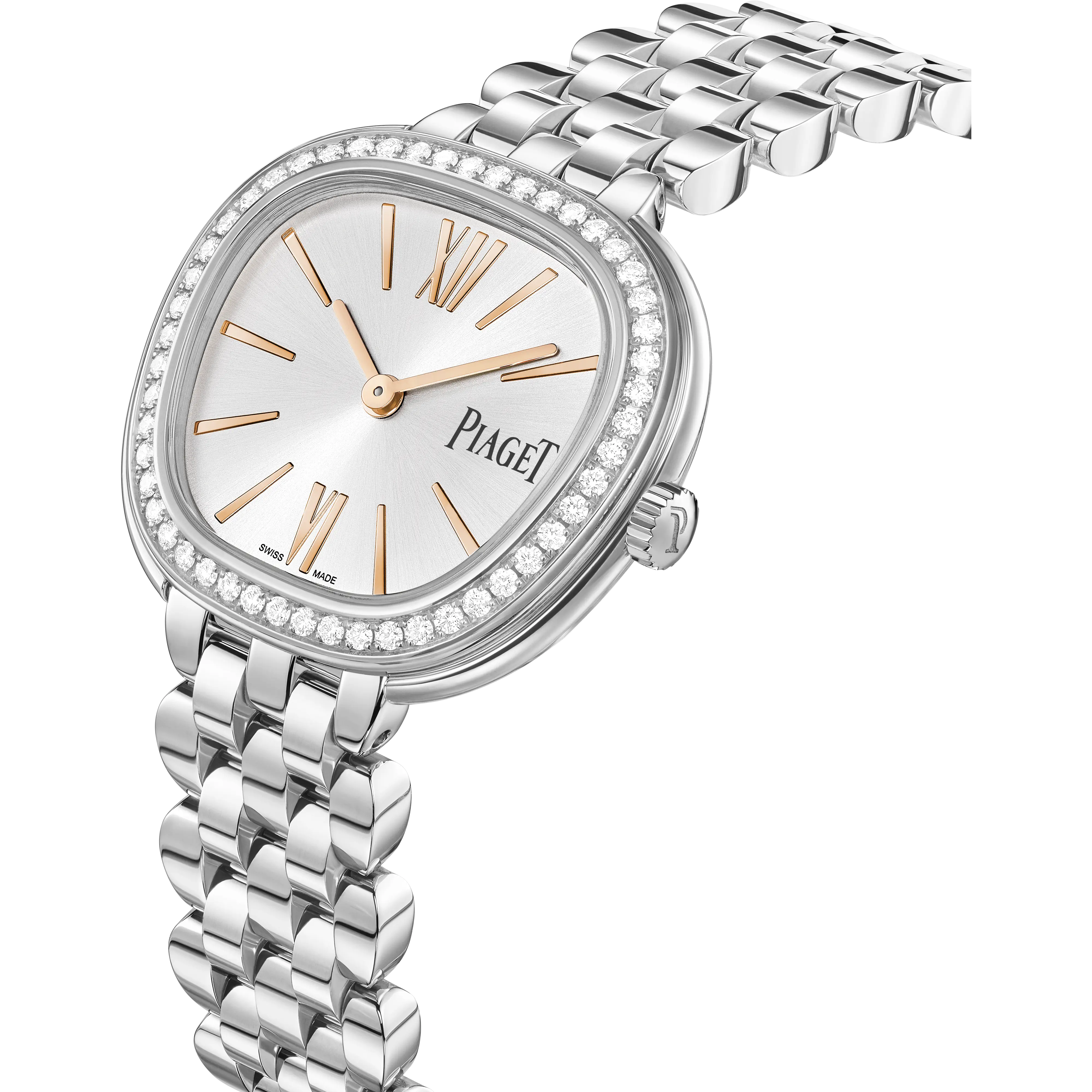 Sixtie watch, 29 mm. Trapeze-shaped case in steel set with 51 brilliant-cut diamonds (approx. 0.52 ct). Sivered solar satin-brushed dial. Bracelet in steel. Piaget 57P quartz movement.