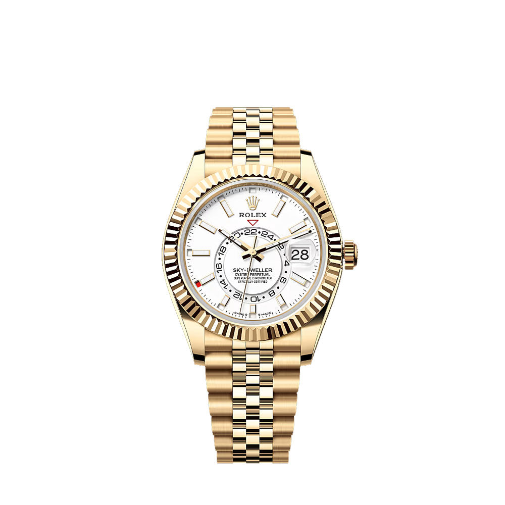 The Oyster Perpetual Sky-Dweller in 18 ct yellow gold with an intense white dial and a Jubilee bracelet.