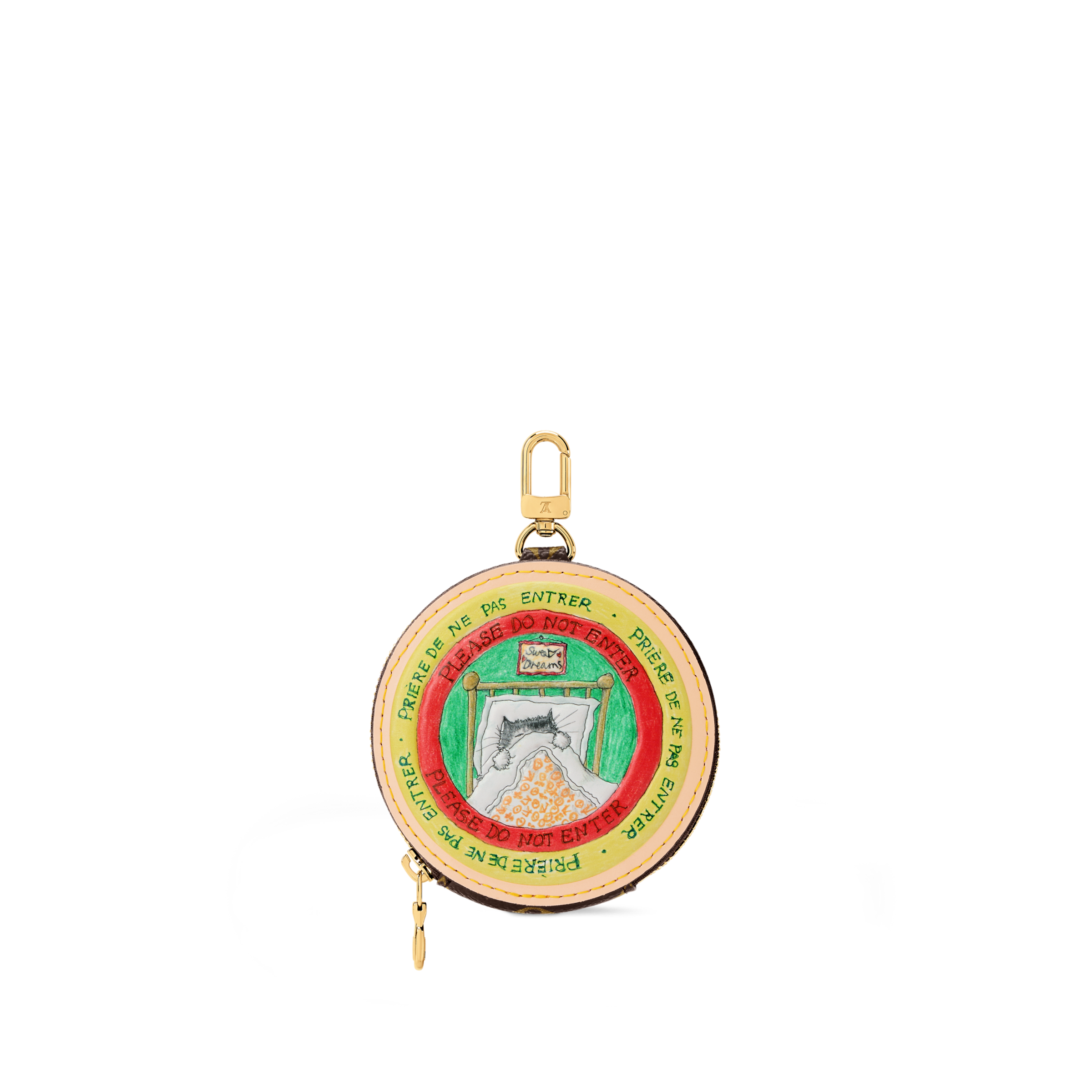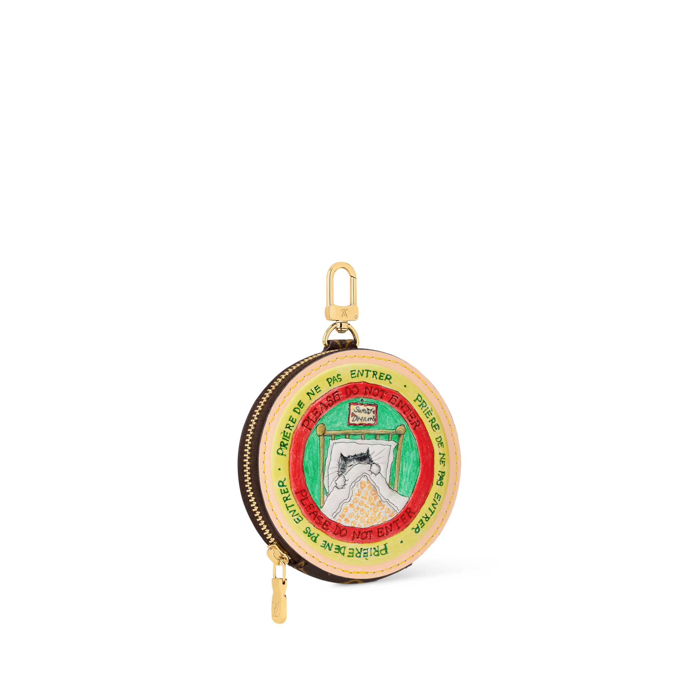 Crafted from cowhide and signature Monogram canvas, this Slippy Coin Purse is part of an exclusive collaboration with legendary fashion icon and artist Grace Coddington. It is defined by a charming and colourful cat motif, which is hand-drawn by Coddington and displays the playful message ‘Please do not enter.’ The round design is finished with a gold-toned zip and hook, which can be attached to keys or other accessories.