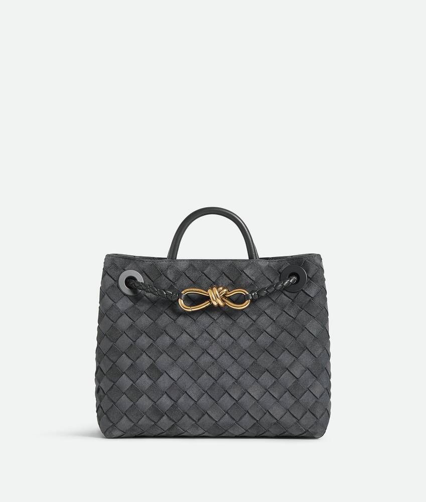 Top handle bag in Intrecciato suede with signature knot detail and sliding cross-body strap.
