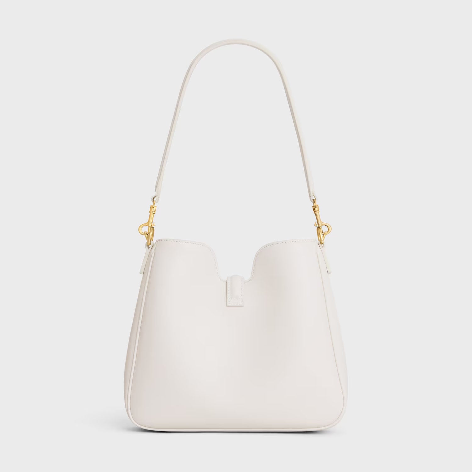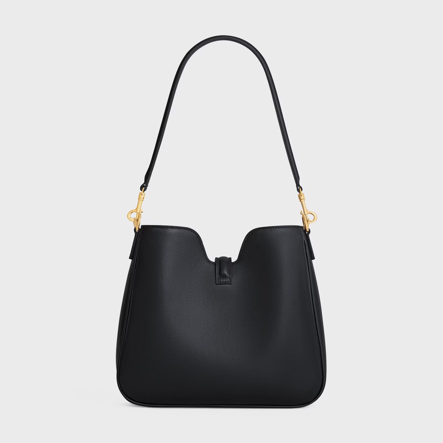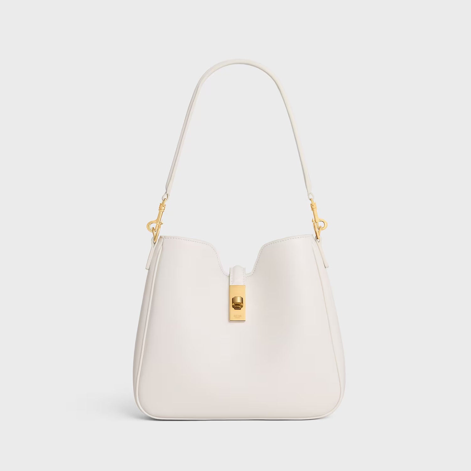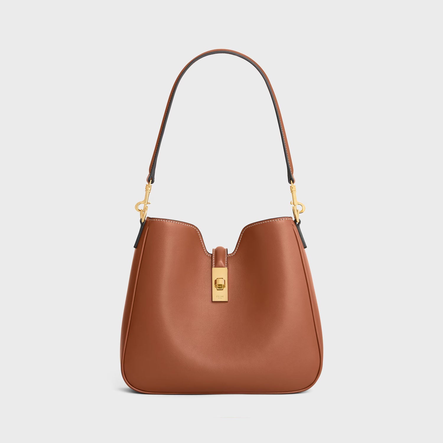 Its refined calfskin leather combines suppleness with a soft touch and shiny finish. The reversed construction with piping, distinctive of celine’s leathergood craftsmanship, further accentuates its round hand.its structured cut is borrowed from the 16 soft tote bag and gives it a sophisticated and singular appearance. The leather flap folds in line with the house’s gold finish iconic turnlock closure, shaped like a discreet jewel.