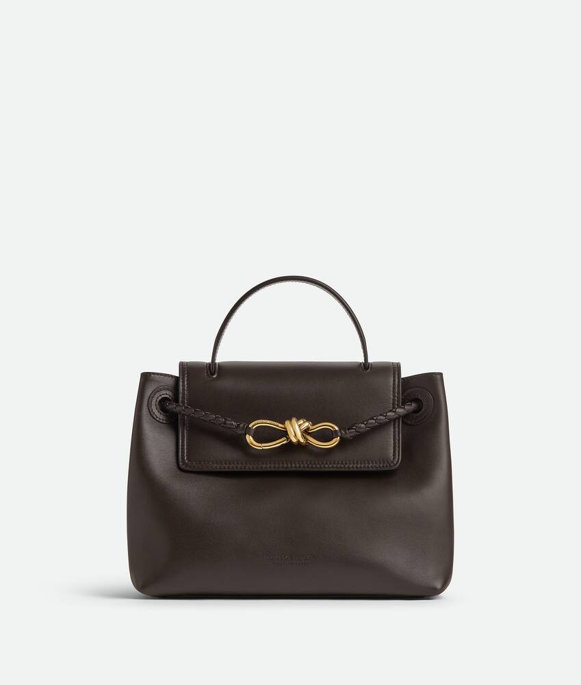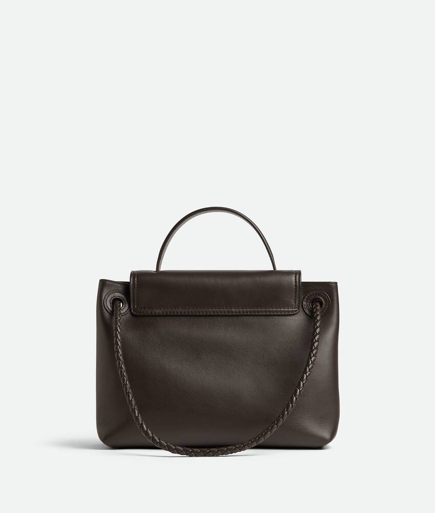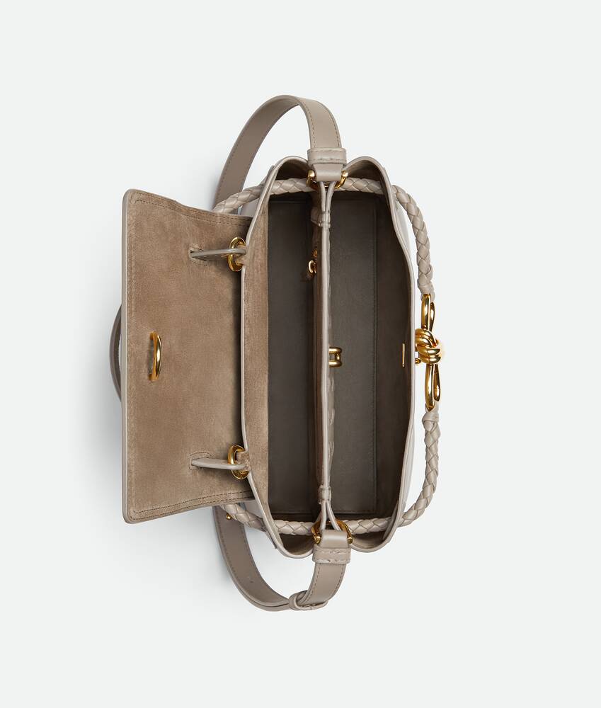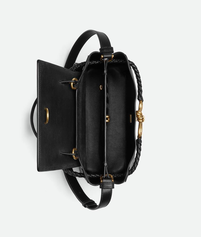 Features a hidden hook closure, allowing the flap to be closed in the front or attached to the interior Intrecciato pocket.