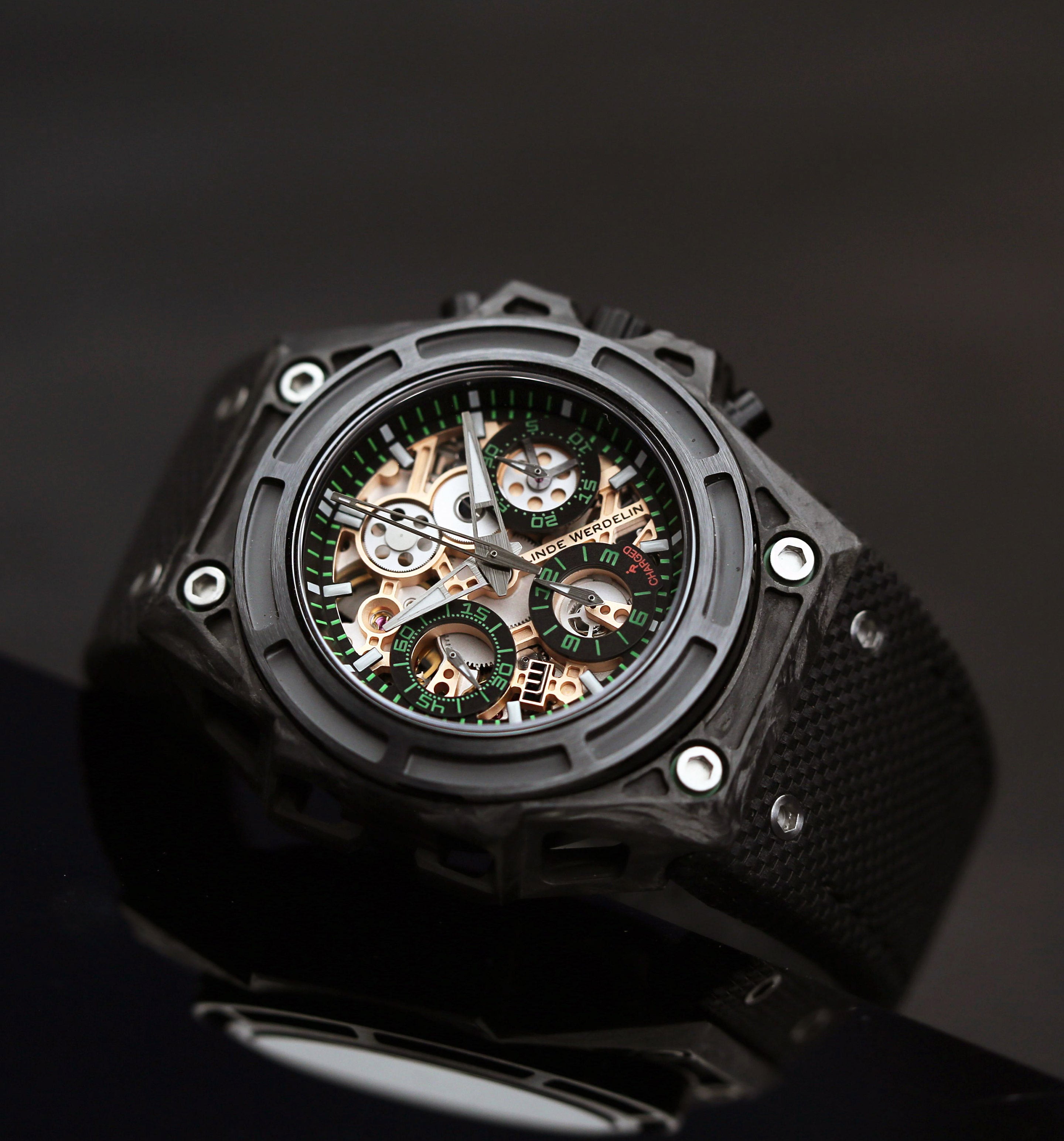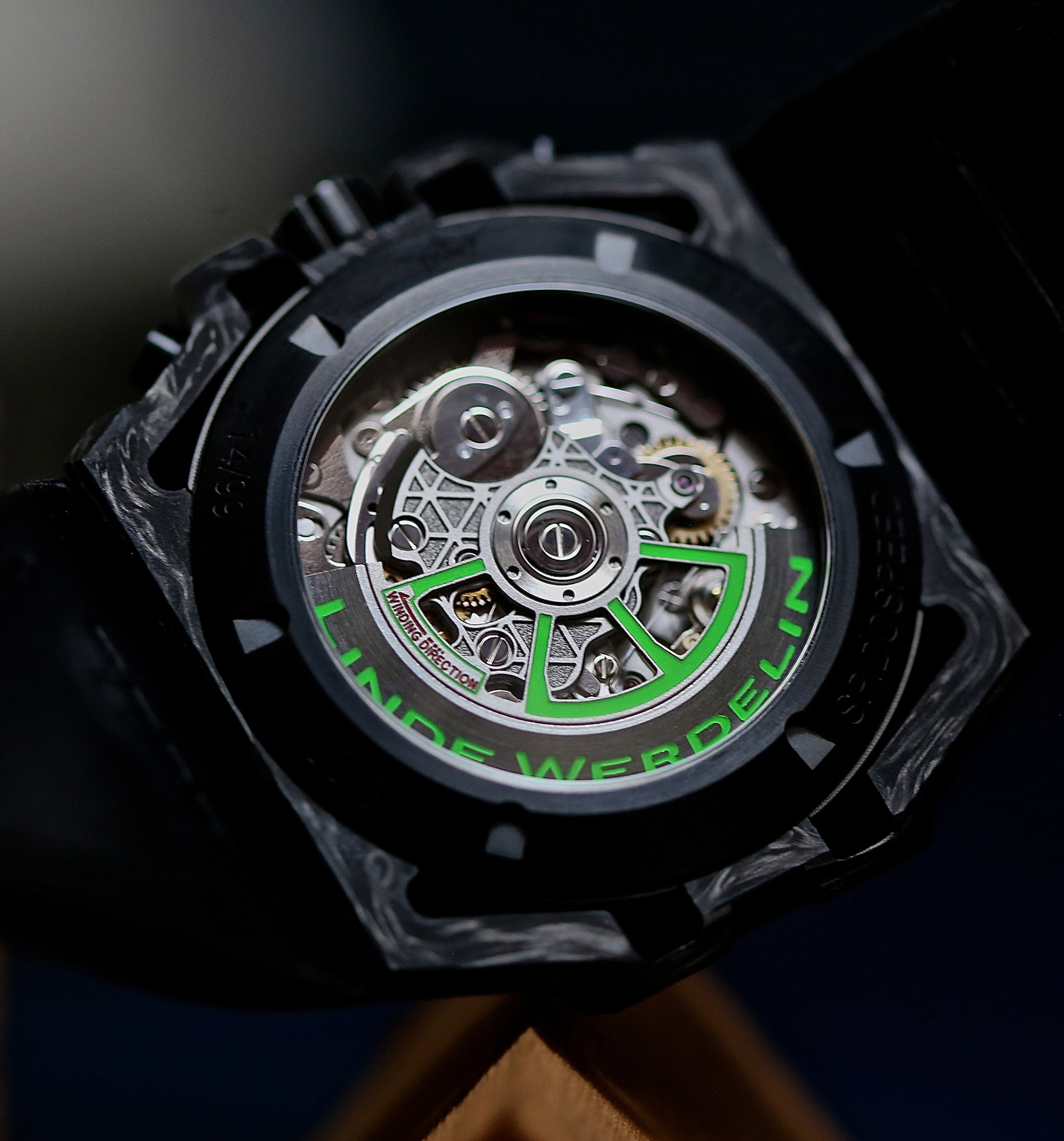 The SpidoSpeed Carbon Green showcases skeletonisation not only throughout the outer case as with previous iterations in the Spido family, but also into the dial and movement. The rugged forged carbon outer case is complimented by other smaller details making this timepiece truly unique, such as the LW-shaped stylised rotor, pusher level engraving on the inner case, and the new signature Linde Werdelin pattern visible on the movement plate.