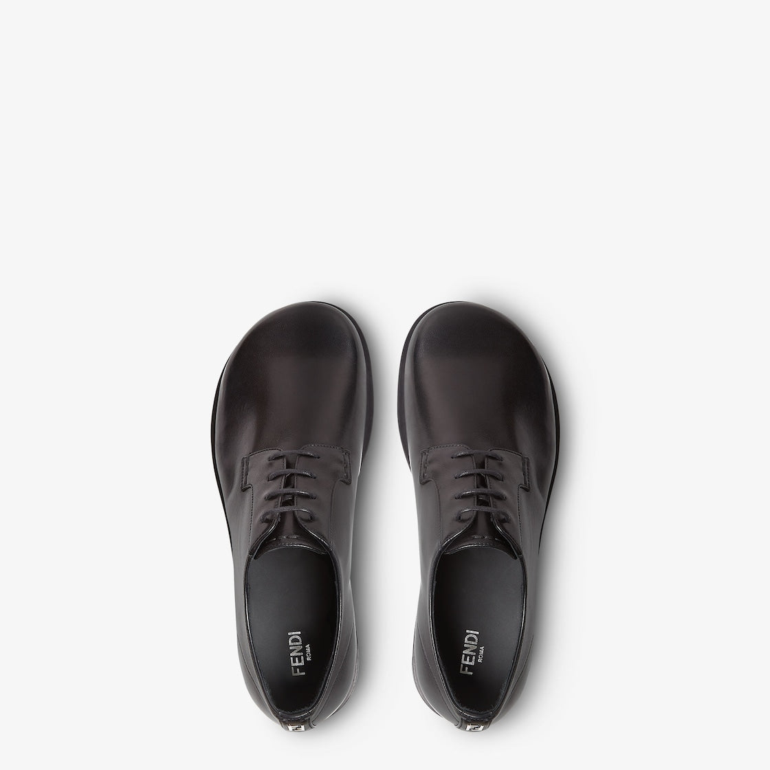 Derby lace-up shoes featuring the iconic rounded toe of the Fall-Winter 2025 fashion show. Made of high-quality, soft black nappa leather with a natural, warm feel. FF detail on the heel with a shiny palladium finish. Leather soles.