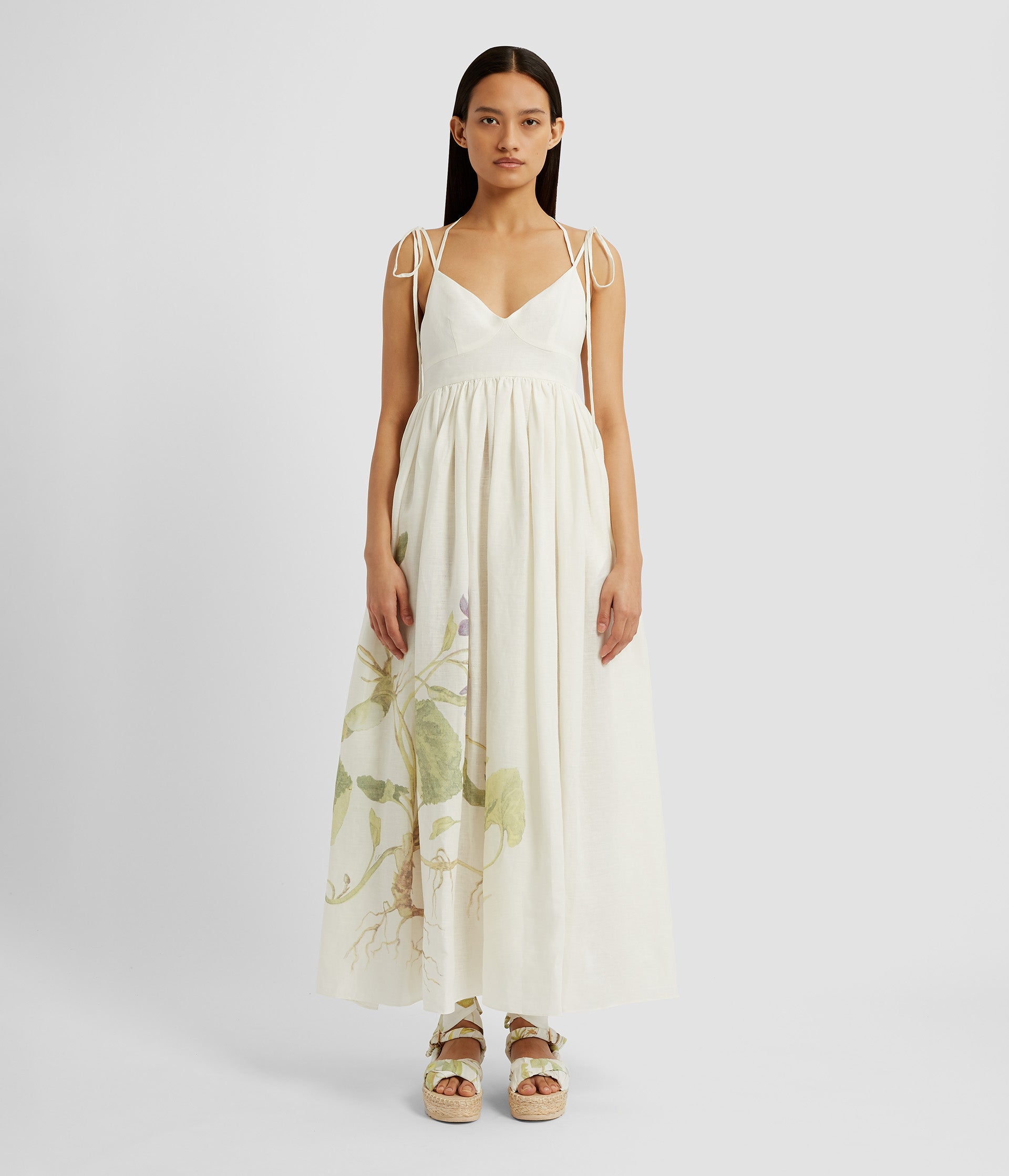 Crafted from lightweight linen, this white dress is decorated with a botanical illustration of a violet. It has a tie-fastening halterneck and shoulder straps, a V-neck, and is fitted beneath the bust.