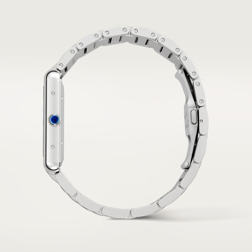 Tank Must watch, extra-large model, mechanical movement with automatic winding, calibre. Steel case, beaded crown set with a synthetic cabochon-shaped spinel, silvered flinqué dial, blued-steel sword-shaped hands, steel bracelet, calendar aperture at 6 o'clock. Case dimensions: 41 mm x 31 mm, thickness: 8.4 mm. Water-resistant to 3 bar (approx. 30 metres).