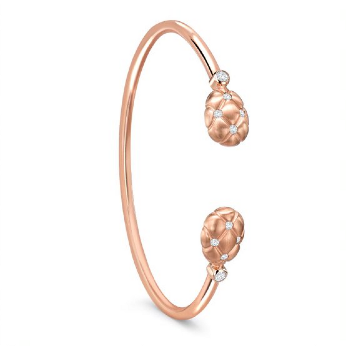 The Treillage Brushed Rose Gold & Diamond Open Set Bracelet displays the perfect marriage of heritage and modernity. This evocative bracelet features brilliant cut round white diamonds and two quilted Fabergé eggs set in 18 karat brushed rose gold. Fabergé has concealed a ruby on the inside of the bracelet - a 'hidden gem' that touches the skin to signify the special bond held between you and your loved one.