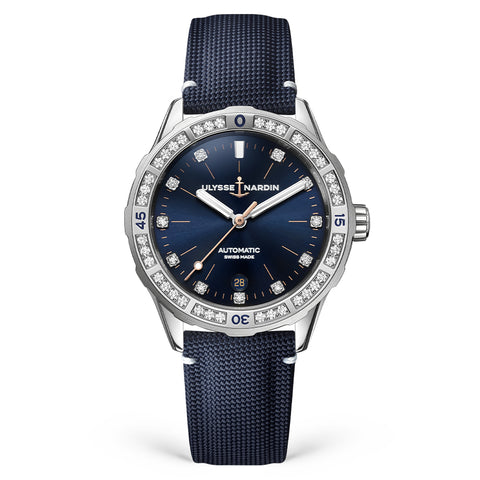 Diver Lady is presented on a fabric strap with a stainless steel pin buckle.
