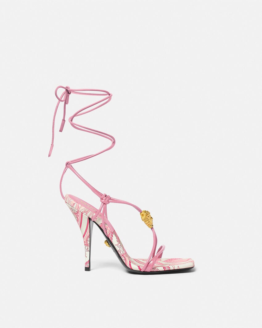 These high-heeled leather sandals feature an Underwater Barocco Allover print on the insole and heel. The strappy style is accented by a three-dimensional La Medusa on the front.