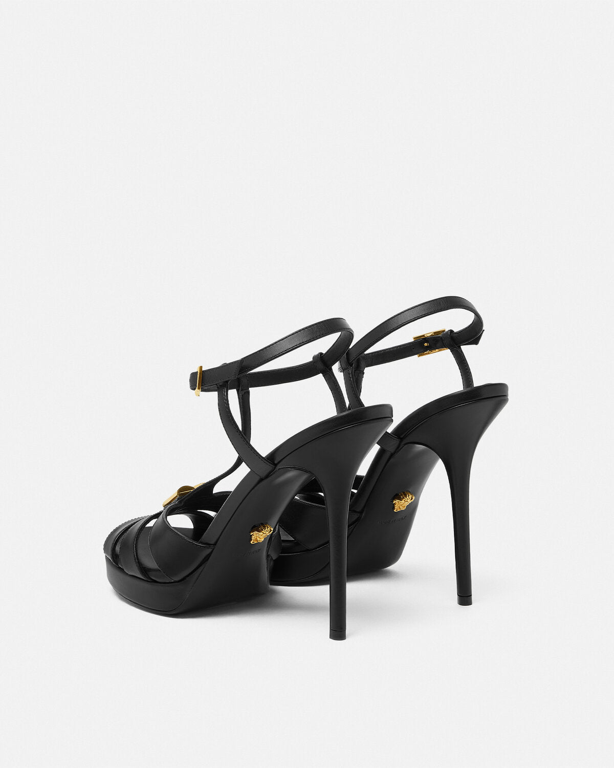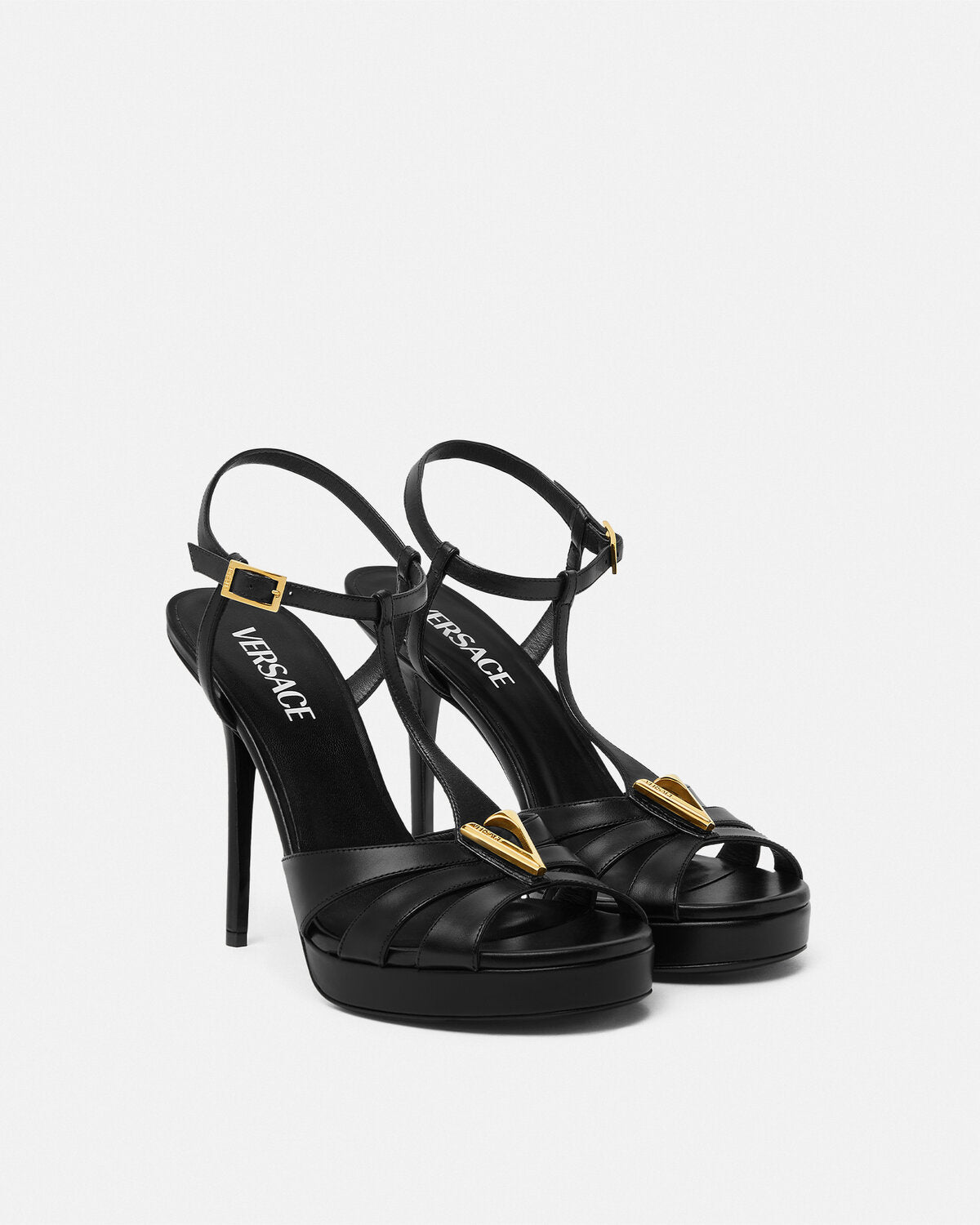 High-heel sandals made from calf leather and featuring a distinctive V hardware with an engraved enamel Versace Logo.