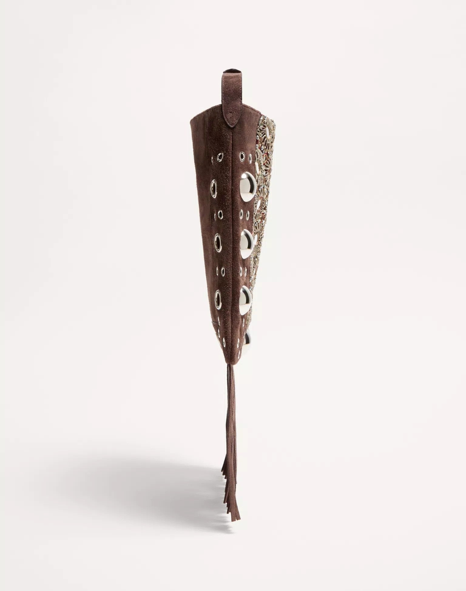 Valentino Garavani Nellcôte shoulder bag with resin mirror and rhinestone embroidery, detailed with fringes. Suede trim decorated with ball studs and rivets. The bag can be comfortably worn on the shoulder/crossbody thanks to the adjustable suede shoulder strap.