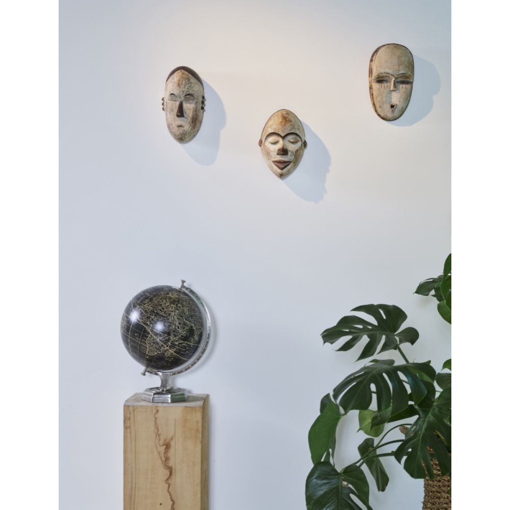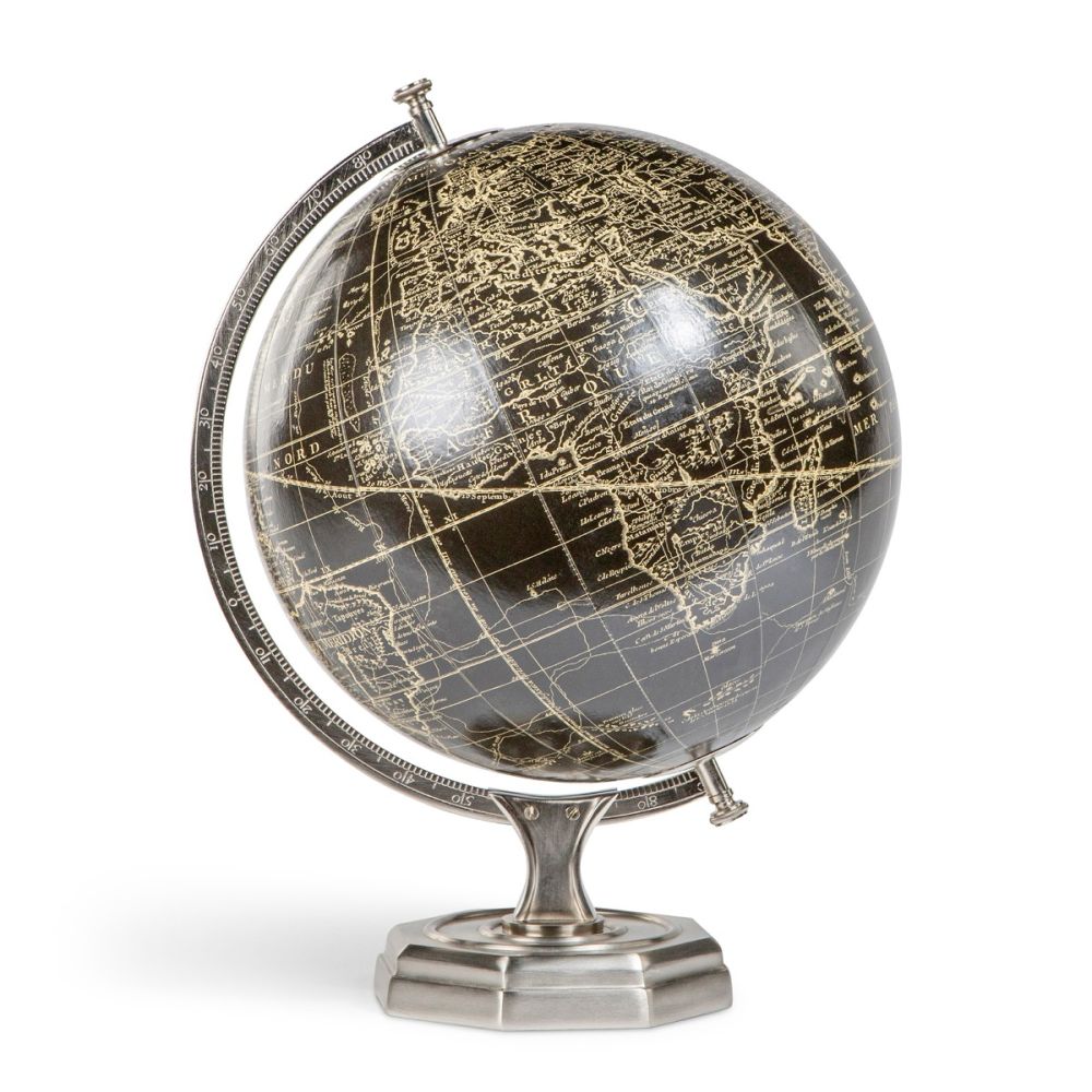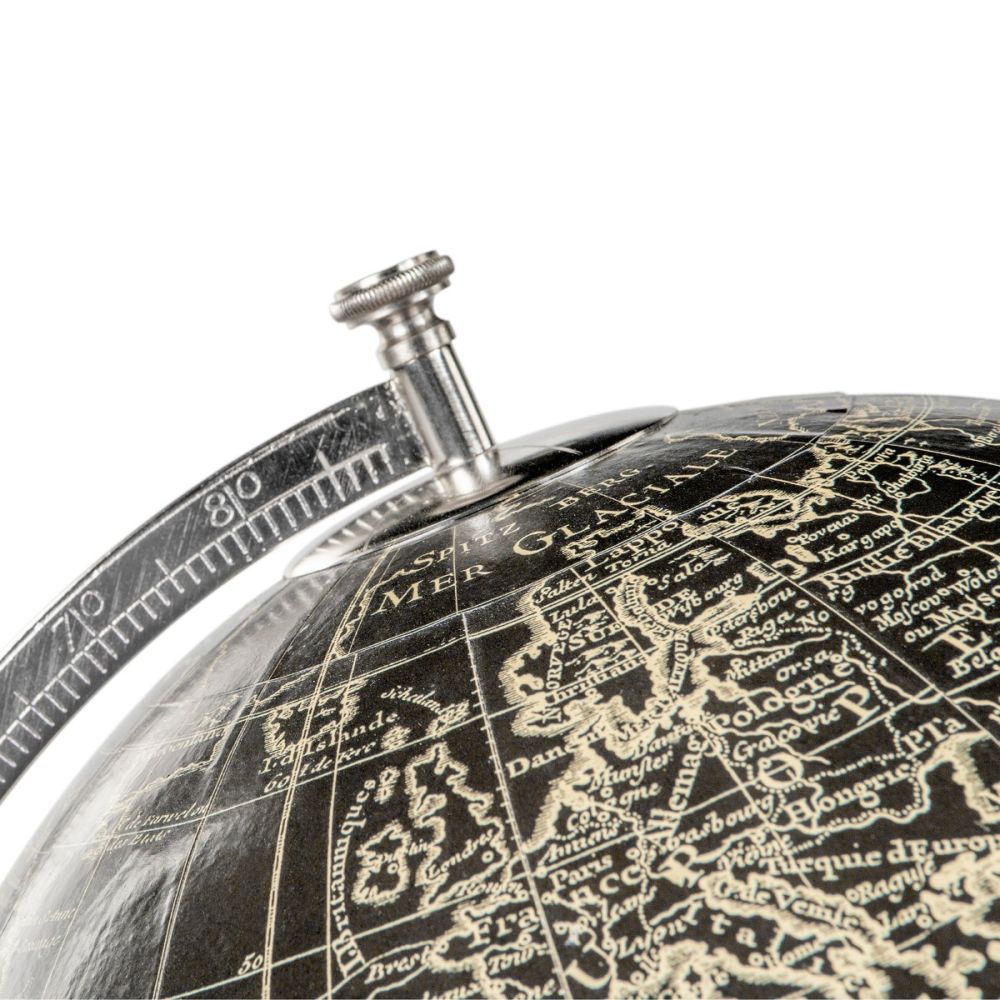 Vaugondy 1700s globe is displayed on vintage silver stand accented in nickel-plated brass. Black and ivory gores are applied to the globe core by hand with authentic construction and detail.