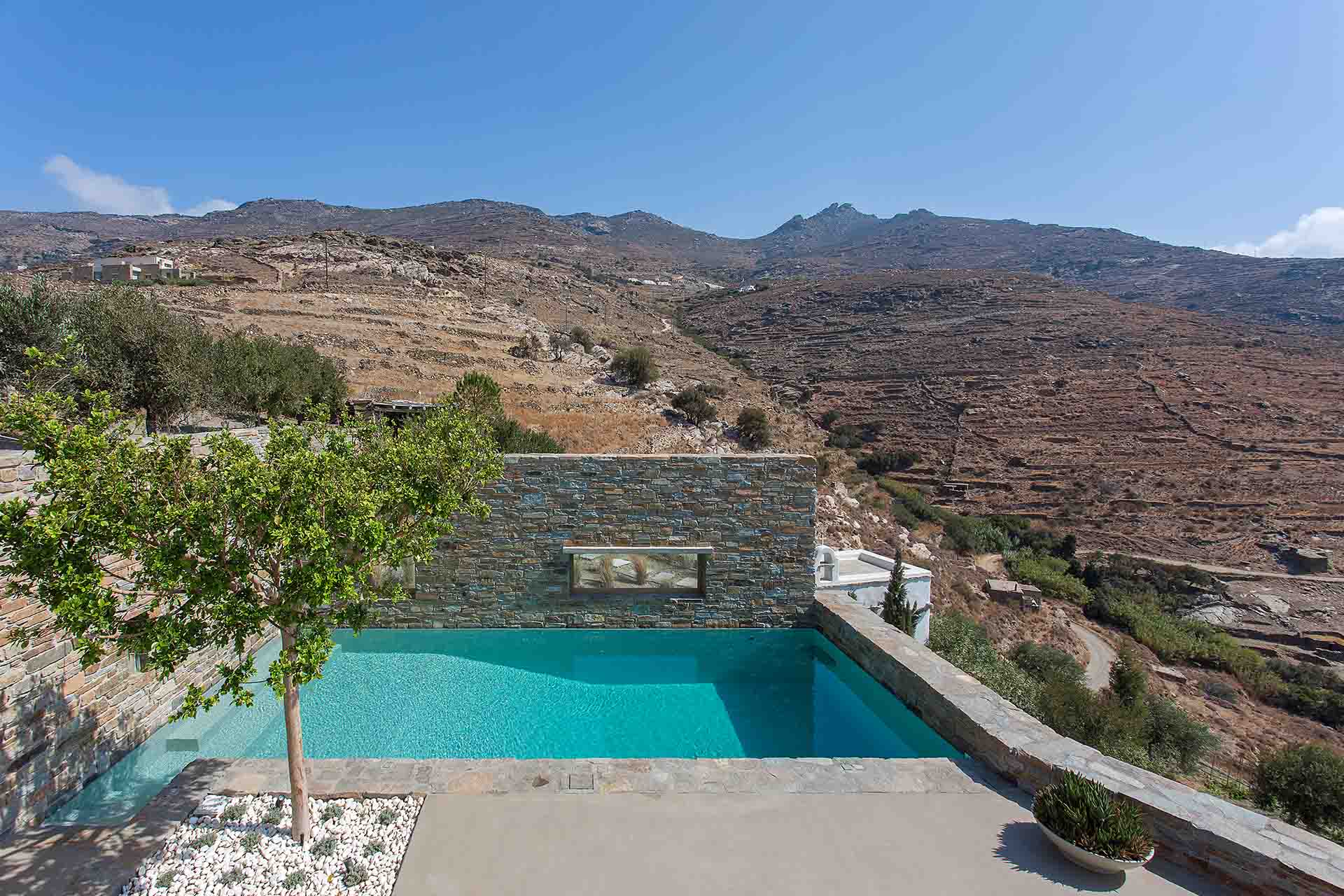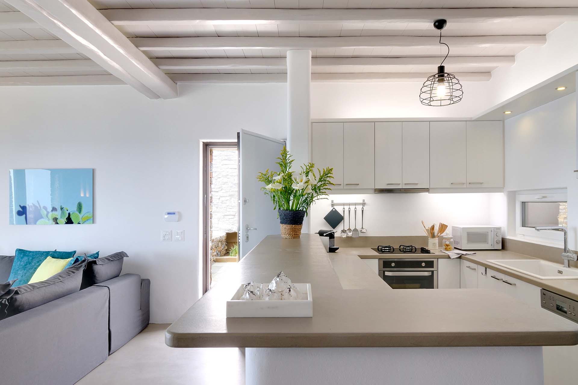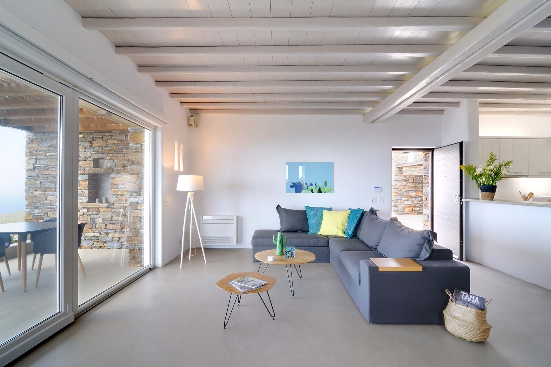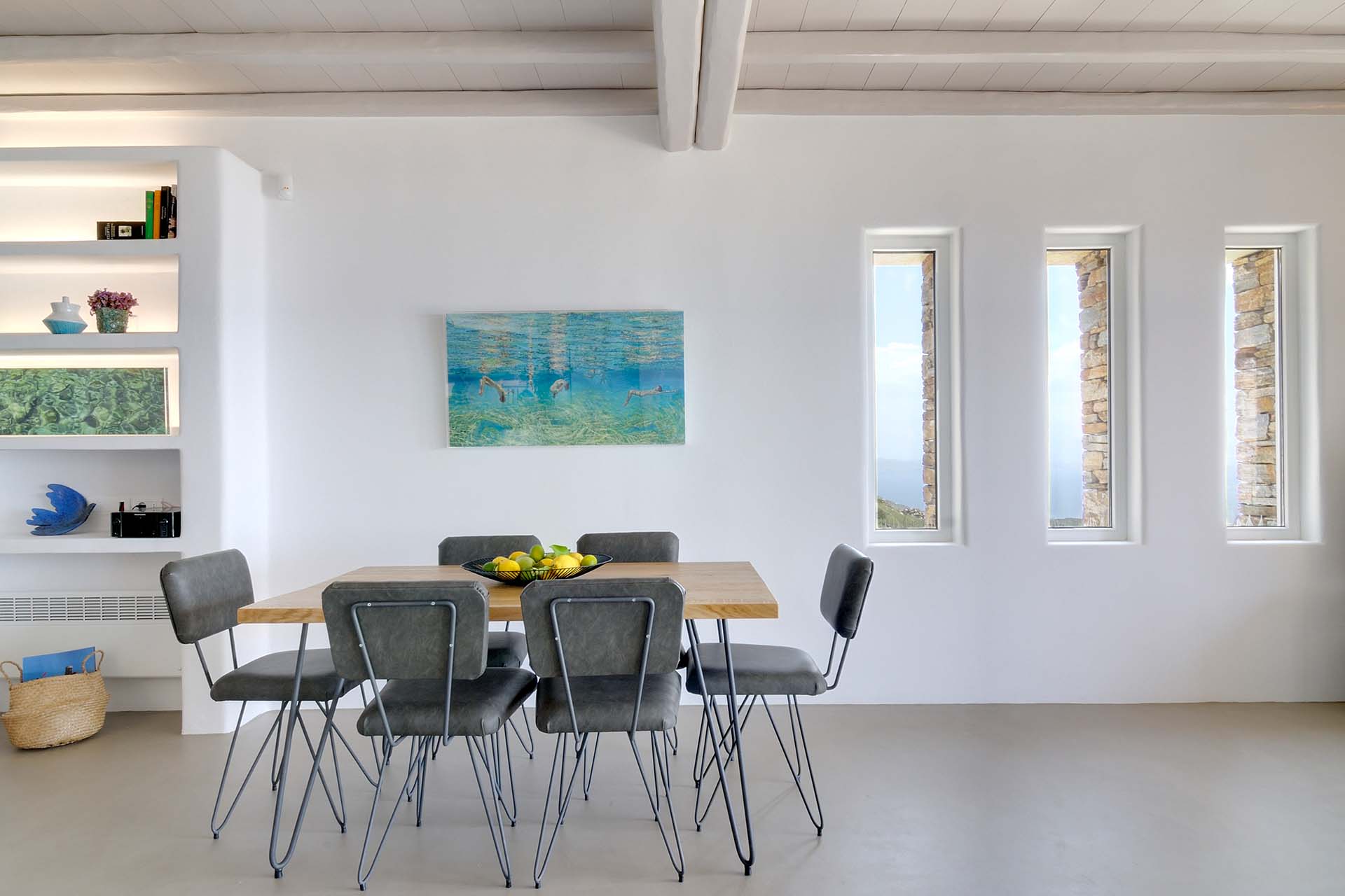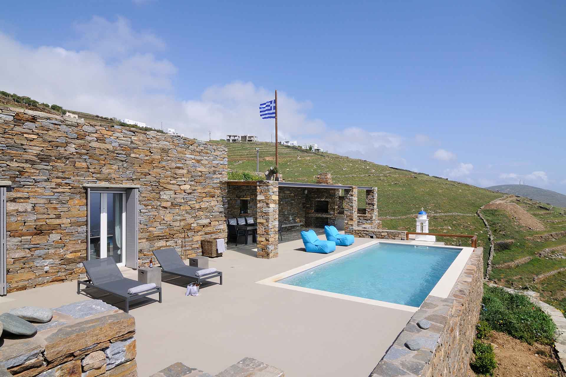 Villa Rosalia is a newly constructed property on a small hilltop on the island of Tinos, overlooking the Aegean Sea and the nearby small villages. Constructed as a farm building over 100 years ago, with a unique style, it has been carefully restored. The house has a fully equipped kitchen, a comfortable living room, and 4 bedrooms with en-suite bathrooms. Filled with built-in double beds, wooden ceilings with ceiling fans, and charming decoration offering a light, airy and relaxing atmosphere that is mirrored in the lovely outdoor areas. The walls are white with polished cement floorings giving a minimalized atmosphere.