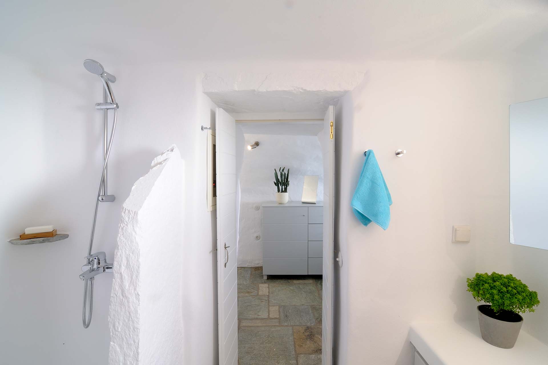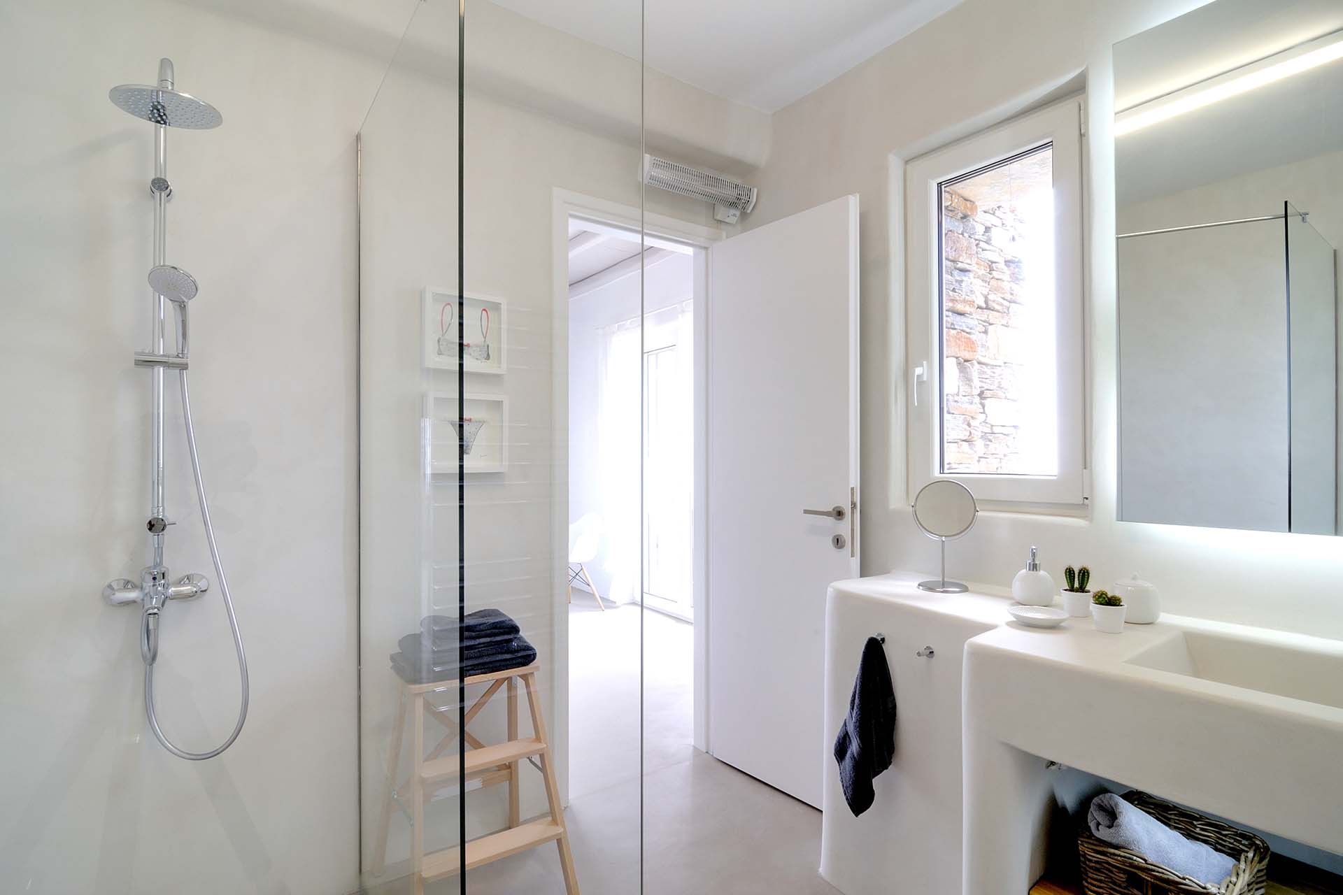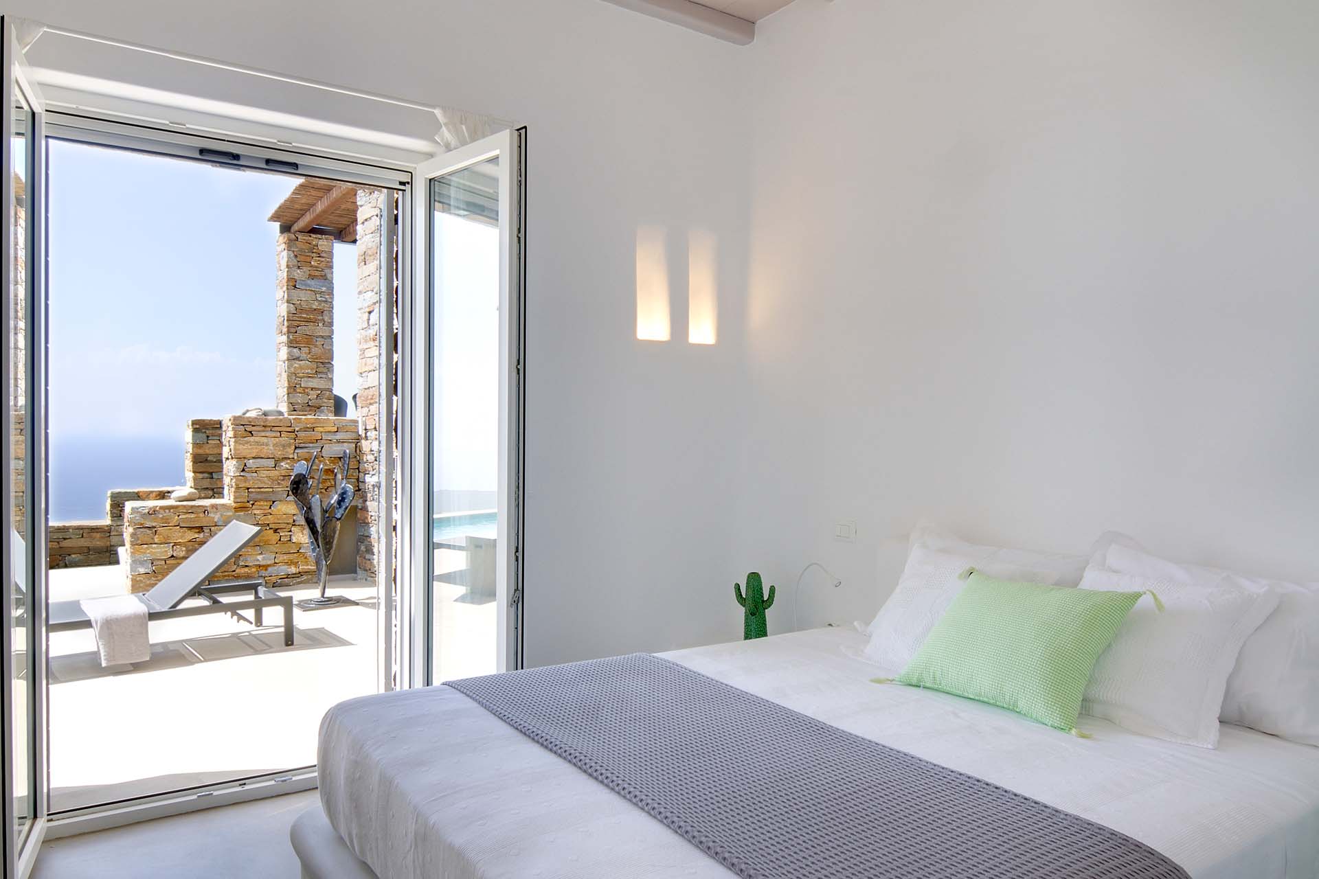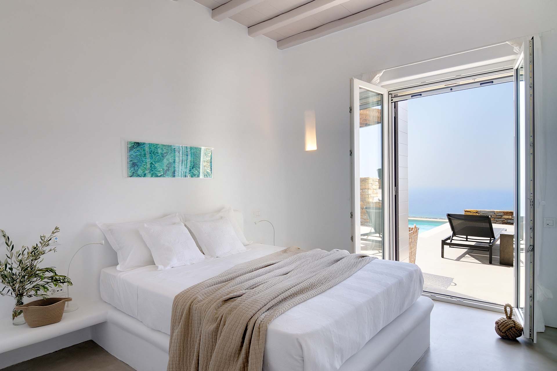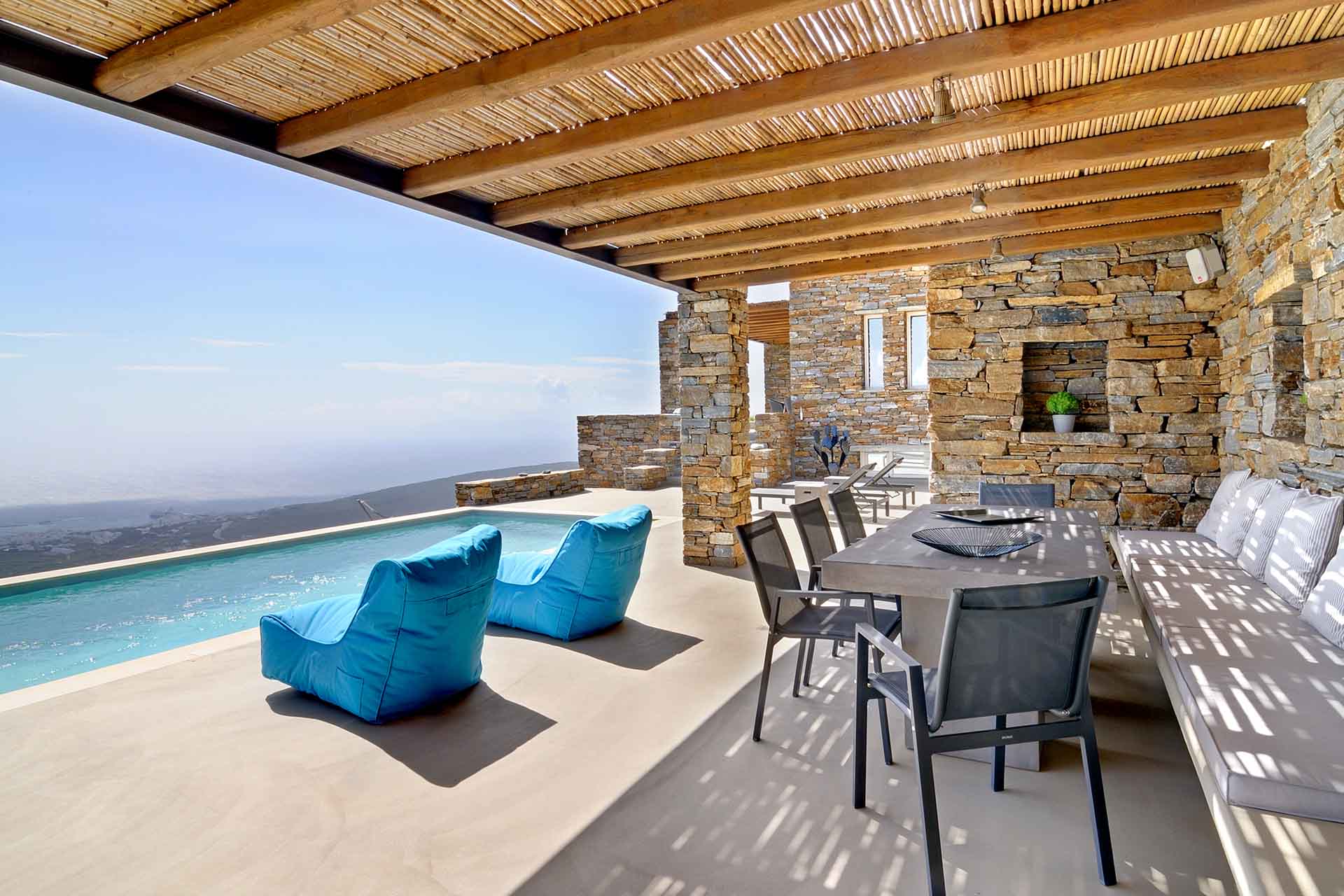 Villa Rosalia is a newly constructed property on a small hilltop on the island of Tinos, overlooking the Aegean Sea and the nearby small villages. Constructed as a farm building over 100 years ago, with a unique style, it has been carefully restored. The house has a fully equipped kitchen, a comfortable living room, and 4 bedrooms with en-suite bathrooms. Filled with built-in double beds, wooden ceilings with ceiling fans, and charming decoration offering a light, airy and relaxing atmosphere that is mirrored in the lovely outdoor areas. The walls are white with polished cement floorings giving a minimalized atmosphere.