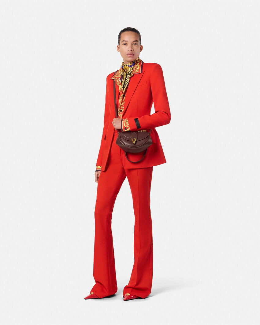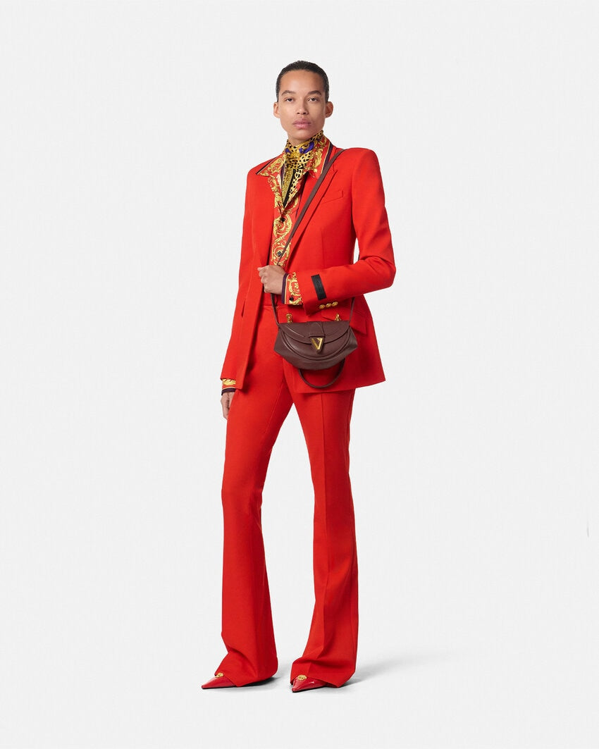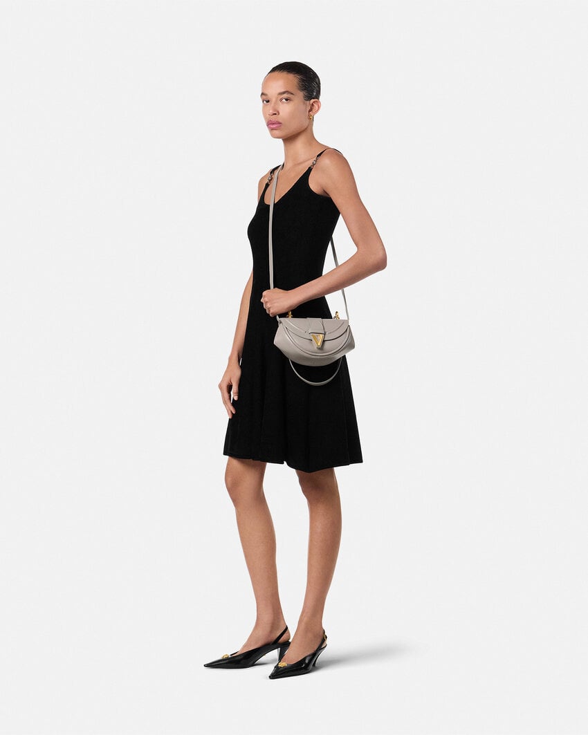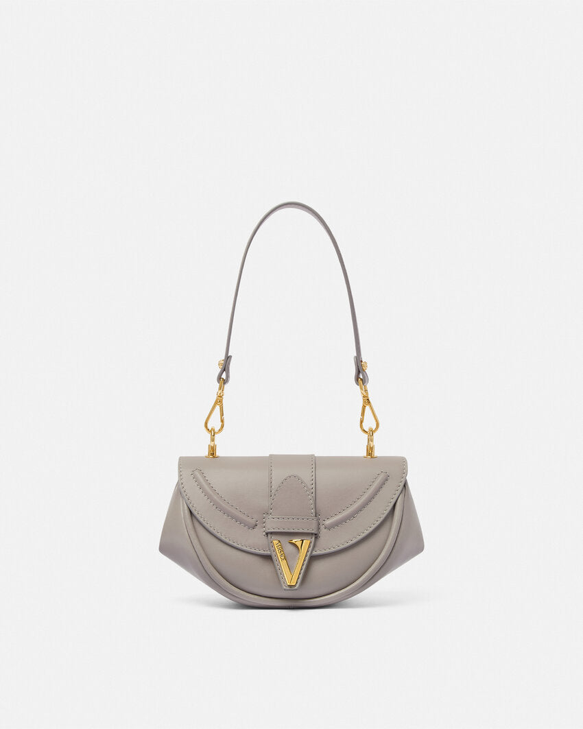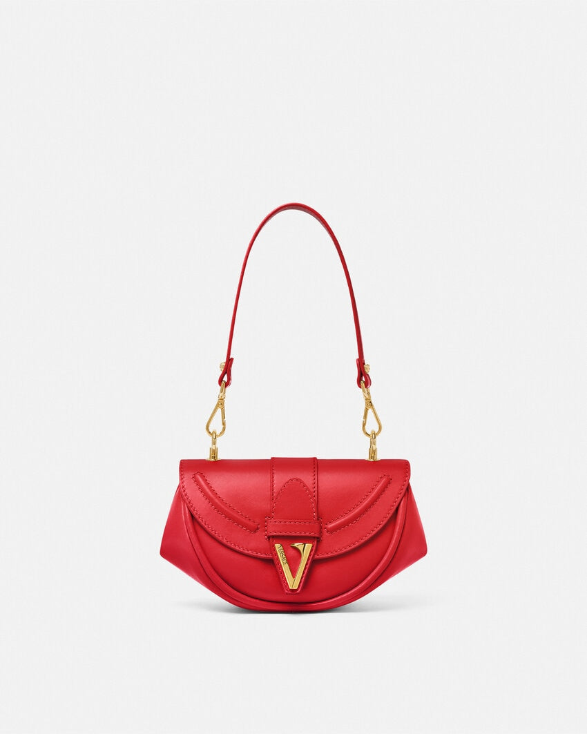 The Virtus shoulder bag, a tribute to Versace's signature iconography, is shaped in a contemporary semi-circular silhouette and made from supple calf leather. The foldover flap is adorned with a striking 'V' emblem and an enamel-engraved Versace Logo. The detachable top handle is further embellished with Medusa stud accents. The small shoulder style is complete with an additional detachable and adjustable shoulder strap for optional crossbody wear.