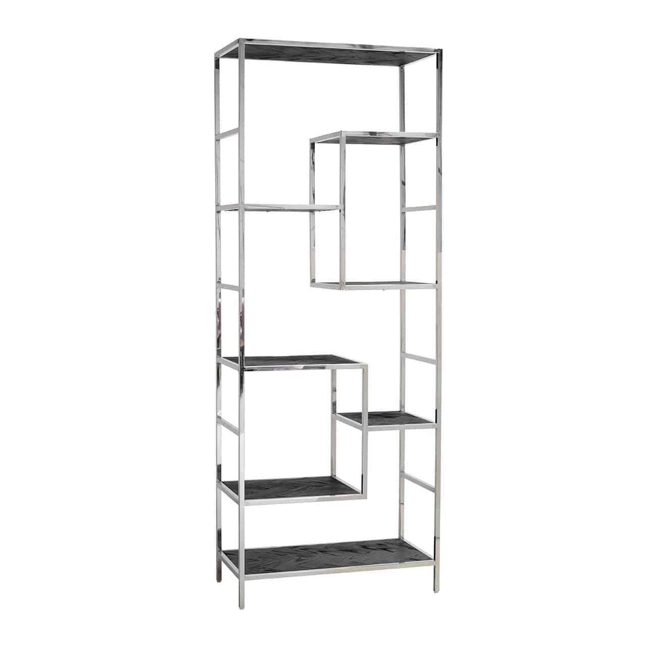 The Blackbone wall cabinet silver has 7 shelves and is made of oak with stainless steel.This black with silver wall cupboard offers enough space for your most beautiful accessories. Elegant, yet cool. Also available with gold.