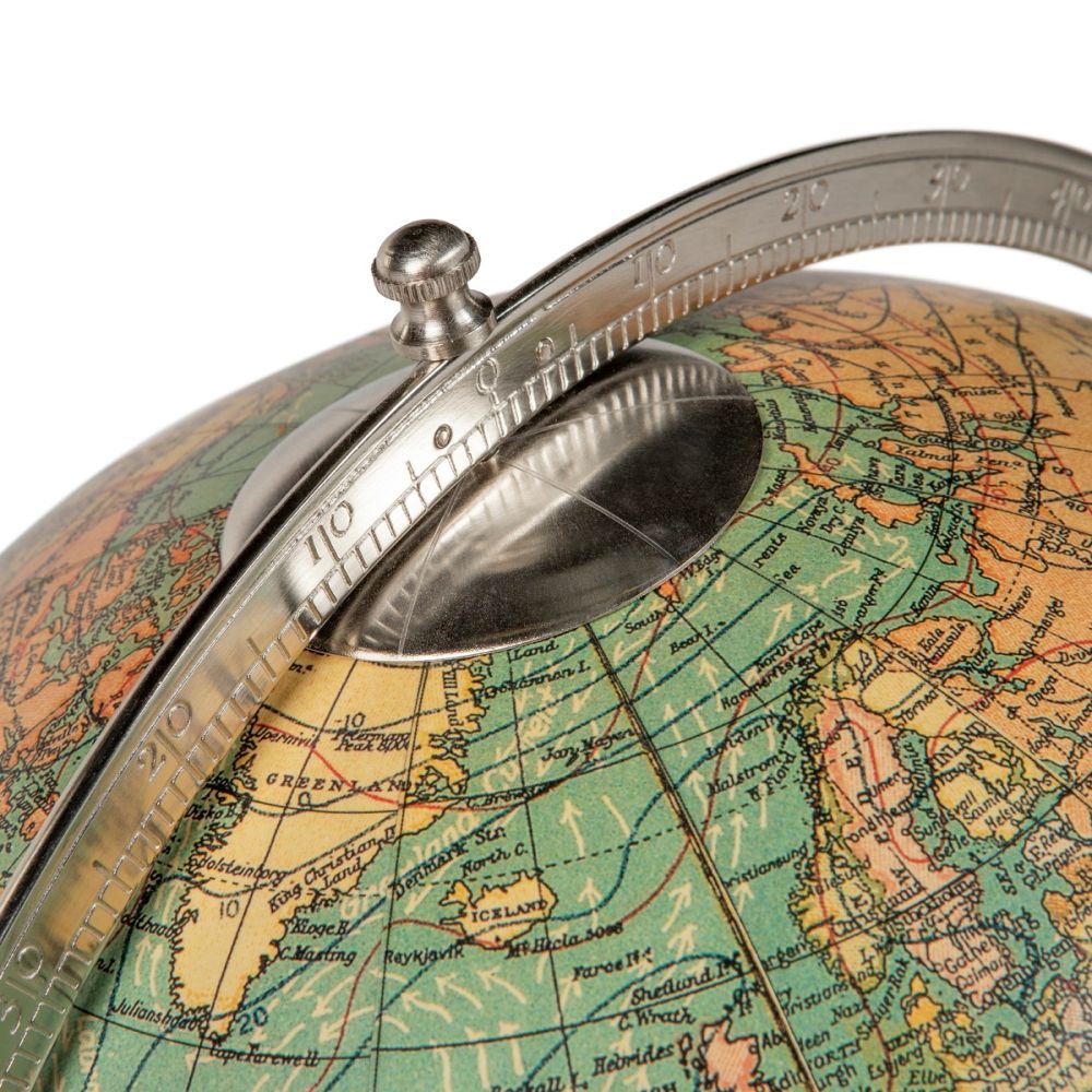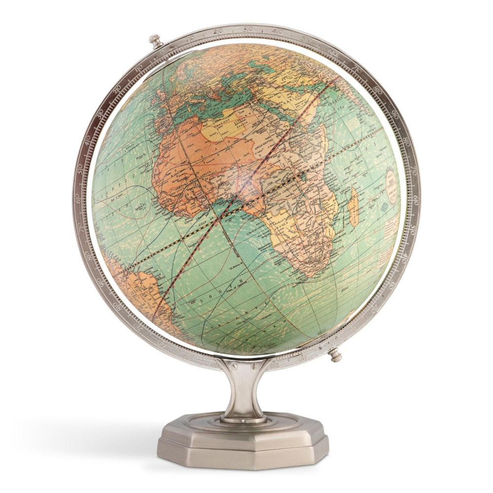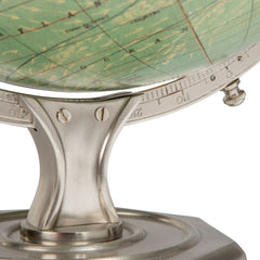 A contemporary classic. The 1920s Weber Costello globe is displayed on a vintage silver stand. Colored gores are applied to the globe core by hand with authentic construction and detail.