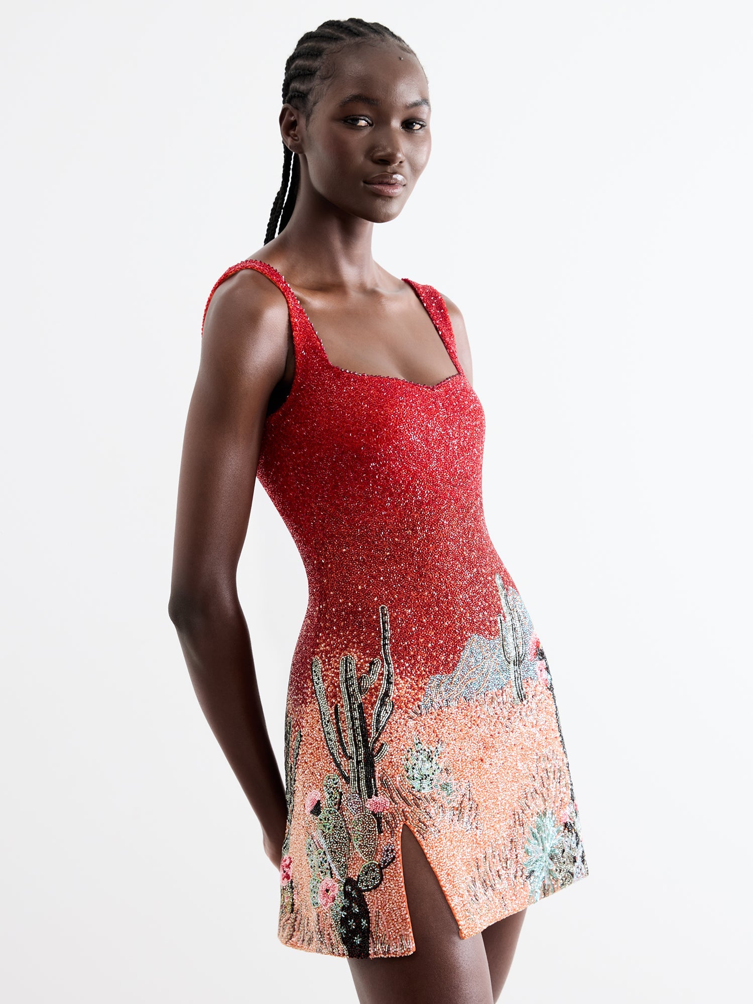 Inspired by the warm glow of a desert sunset, the West Coast Mini dress is tribute to the American West. The dress features a gradient from deep sunset red to soft sandy gold, with dusty blue mountains and blooming cacti - each motif brought to life with breathtaking detail. This is a dress made for golden hours.