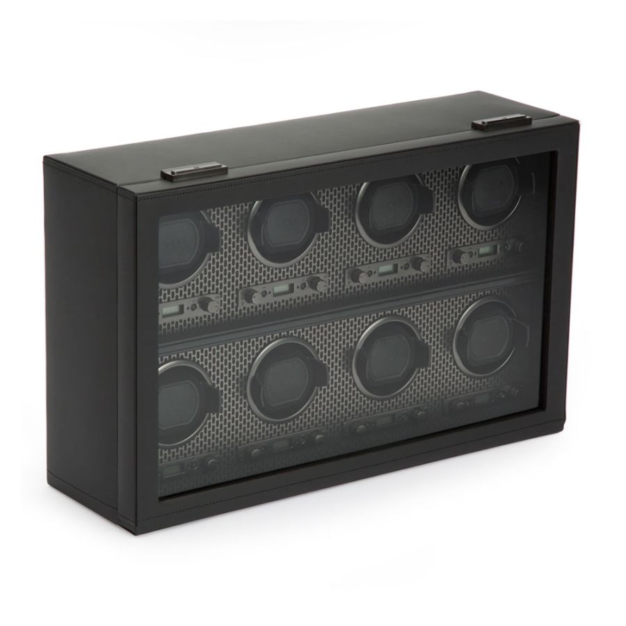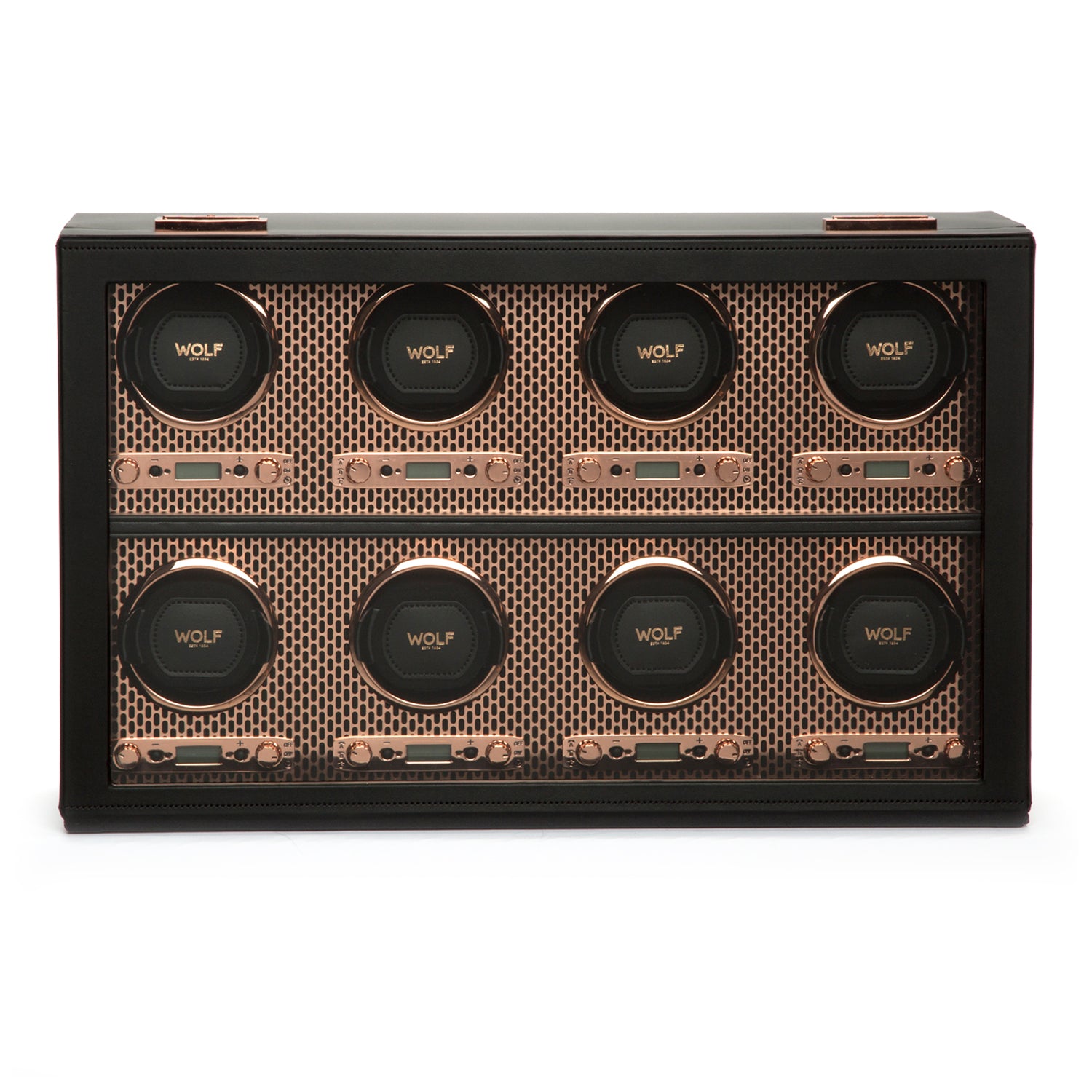 Copper and Powder-coated laser cut perforated steel melded with clean, sleek lines. AXIS drives a modern, bold look for safekeeping your timepieces. Trusted patented technology of counting rotations of the axis of your watch guarantees precise turns per day. Features custom metal plating, locking glass cover, backlit LCD display, powder coated or copper finished hardware and 8 winding modules.