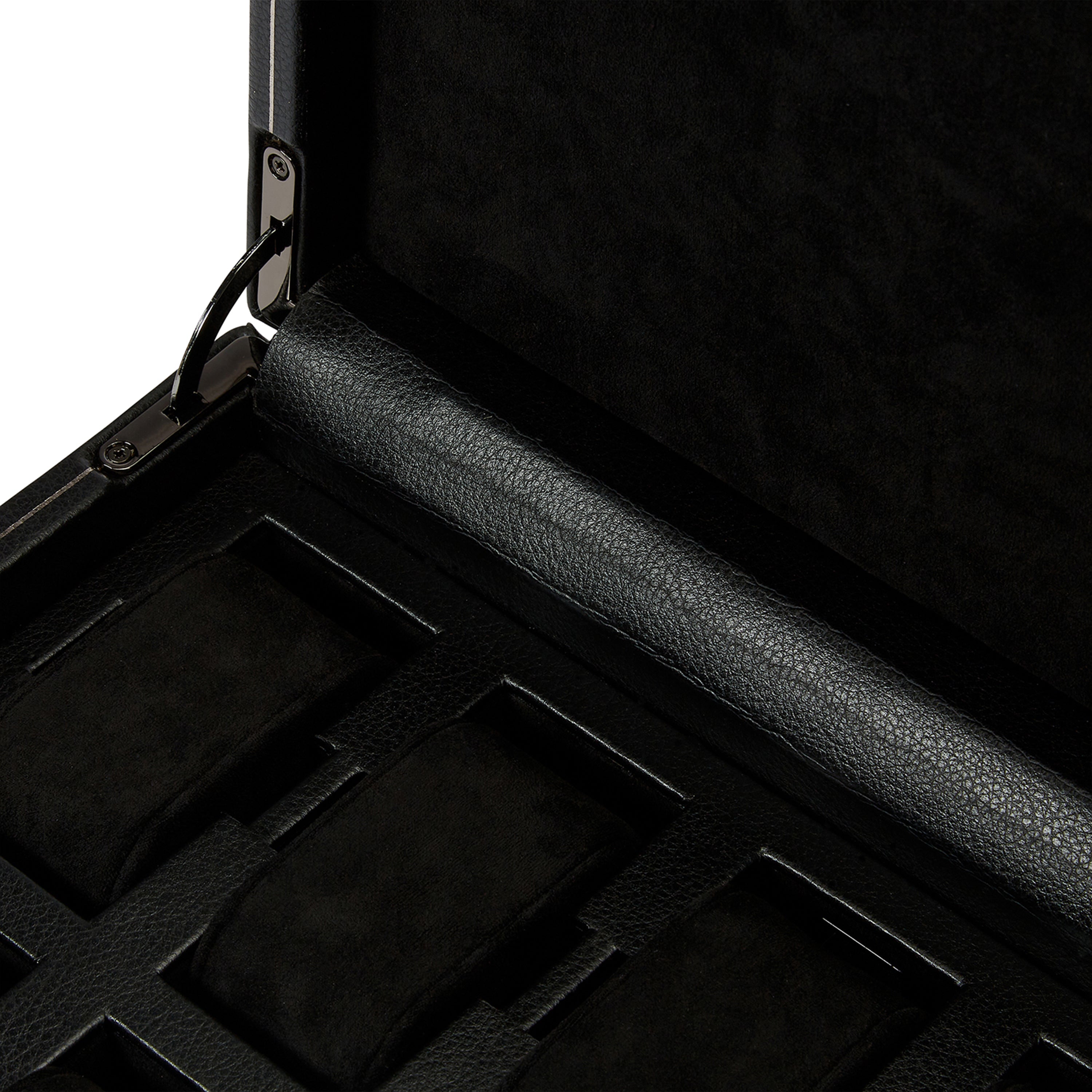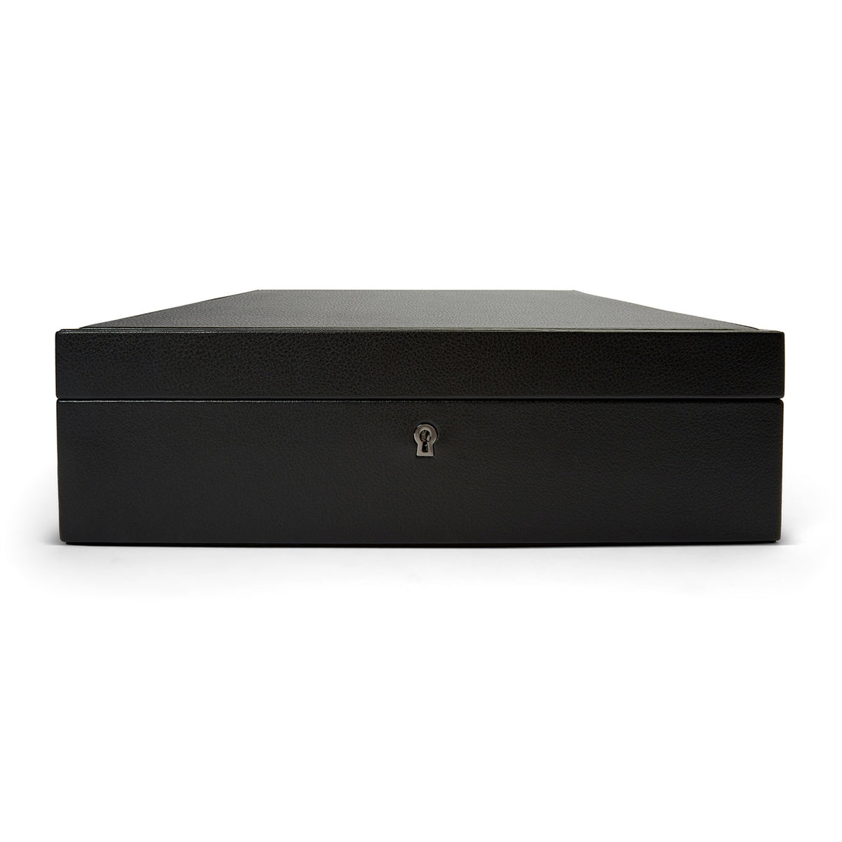 Handmade throughout, British Racing melds the green international motor racing colour of the UK’s cars raced in Ireland in the early 1900’s with a revolutionary quad angled panelled lid. Fine work detailing includes hand-pressed gold foil lines on vegan friendly pebble-grained leather. Gold hardware accents throughout with cushion close hinges. Another design first from WOLF. Protect your watches in style in our 8 piece watch box with storage.