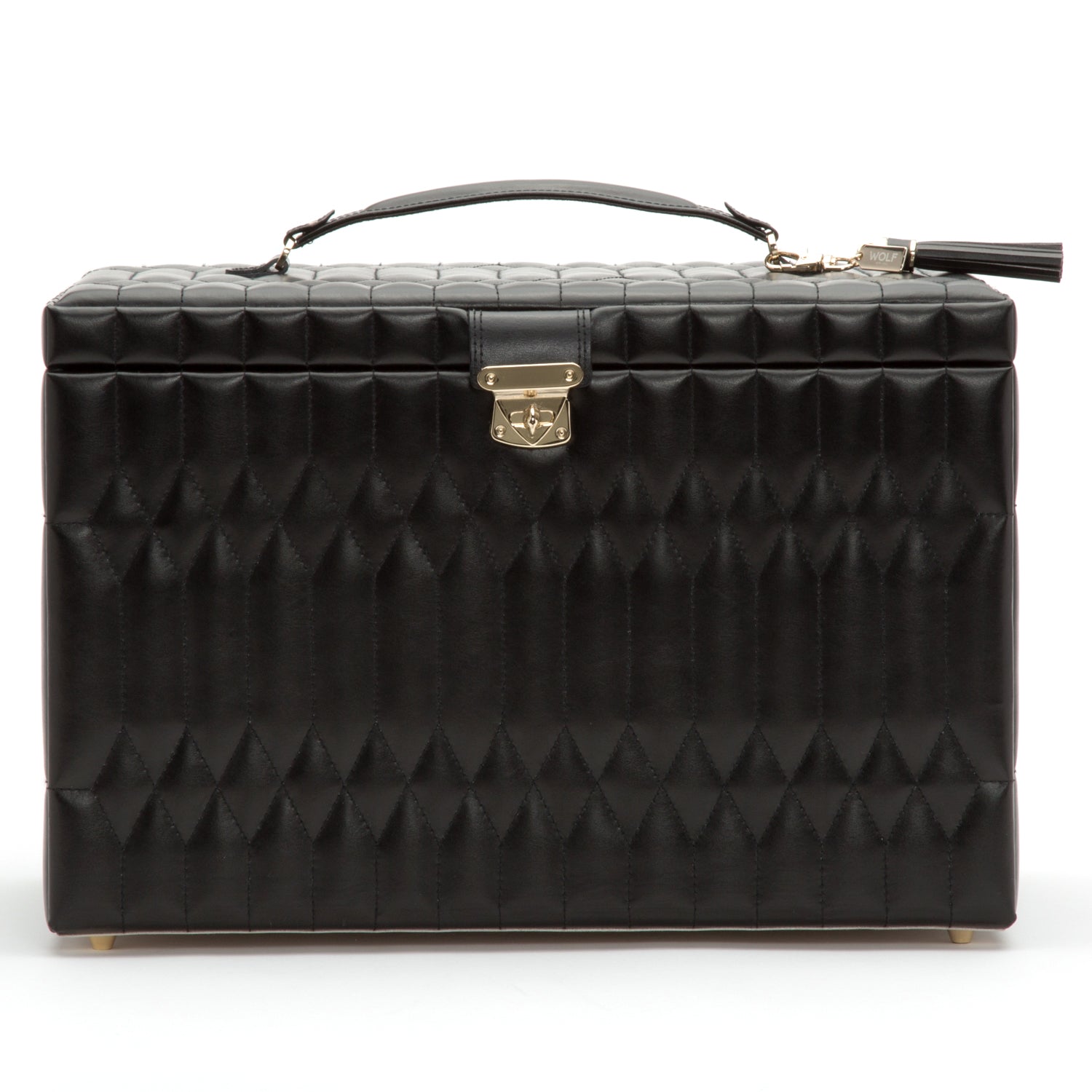 The embodiment of sophistication and style. The Caroline Extra Large Jewelry Case, a timeless classic with elegant soft lines of the 50’s, supple diamond quilted leather accented with gold hardware. This refined case is the perfect home for your precious jewelry and heirlooms.
