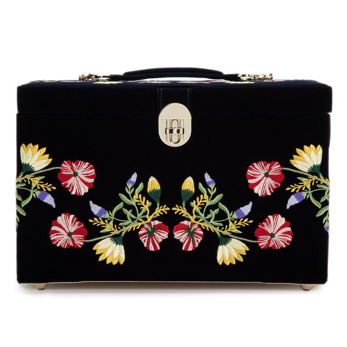 Fresh faced and fun, Zoe is sophisticated but playful. The Large case’s soft mink body highly embroidered with classic floral designs is as beautiful as its accessories inside. Includes mink velvet exterior, LusterLoc™ interior, pale gold hardware, and removable mini travel piece.