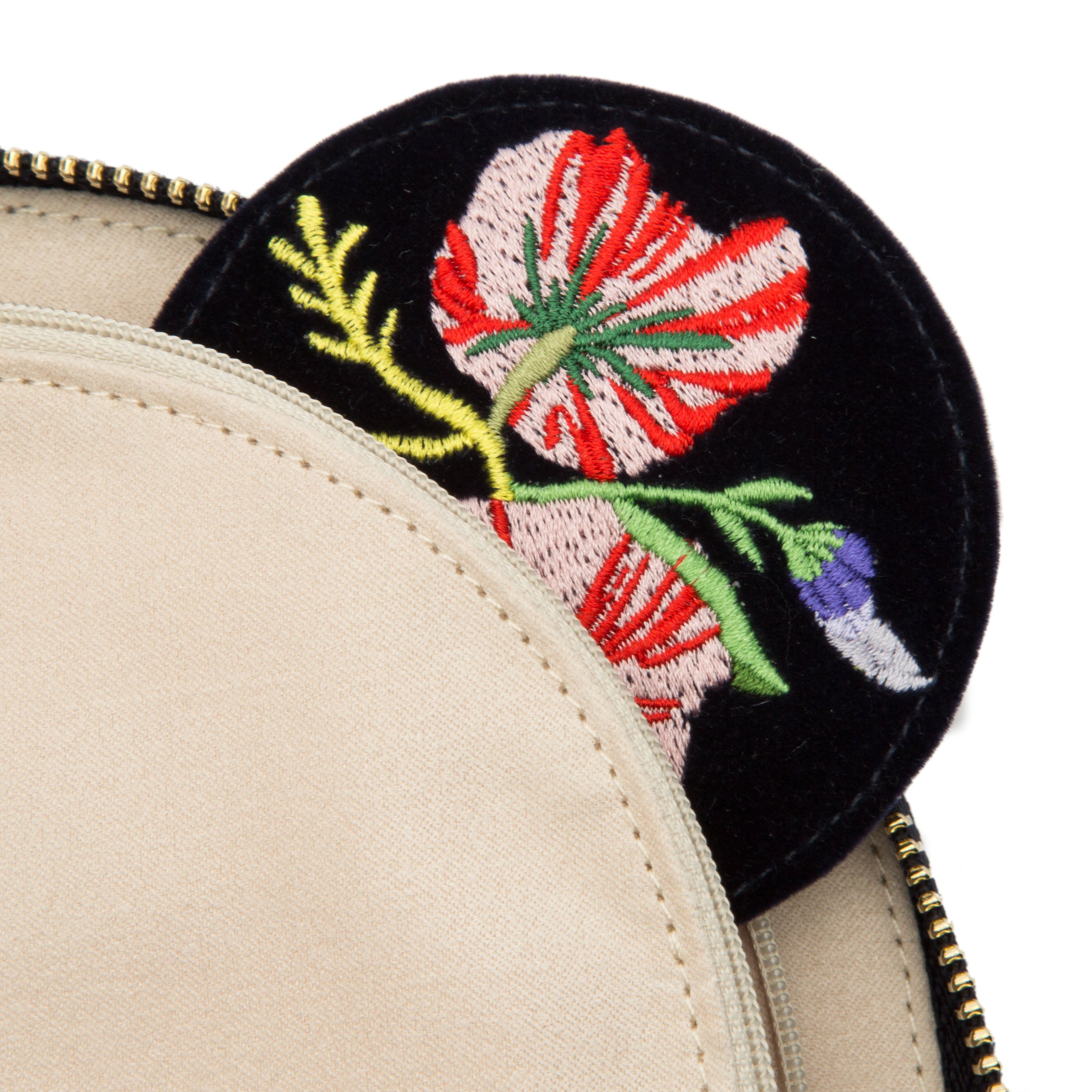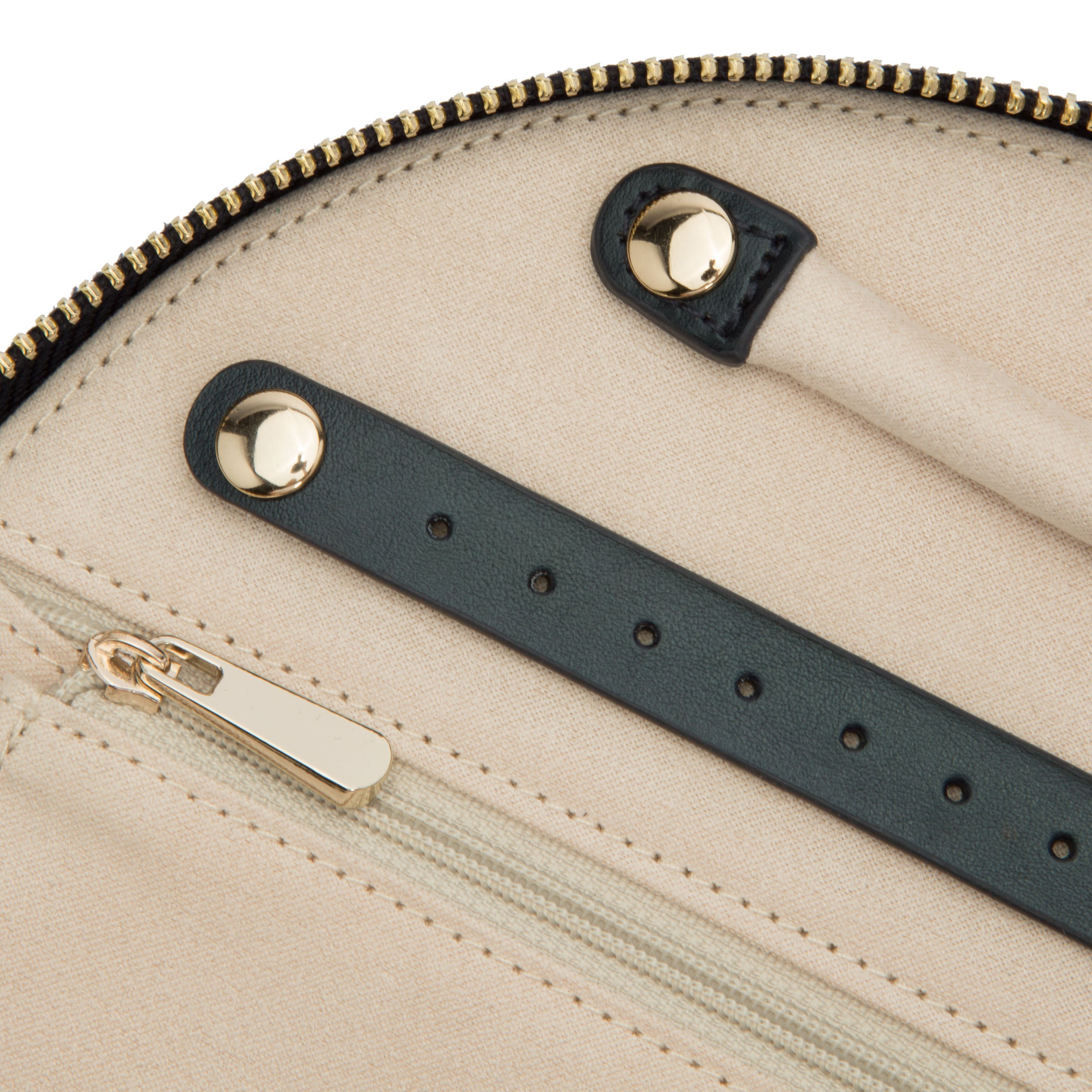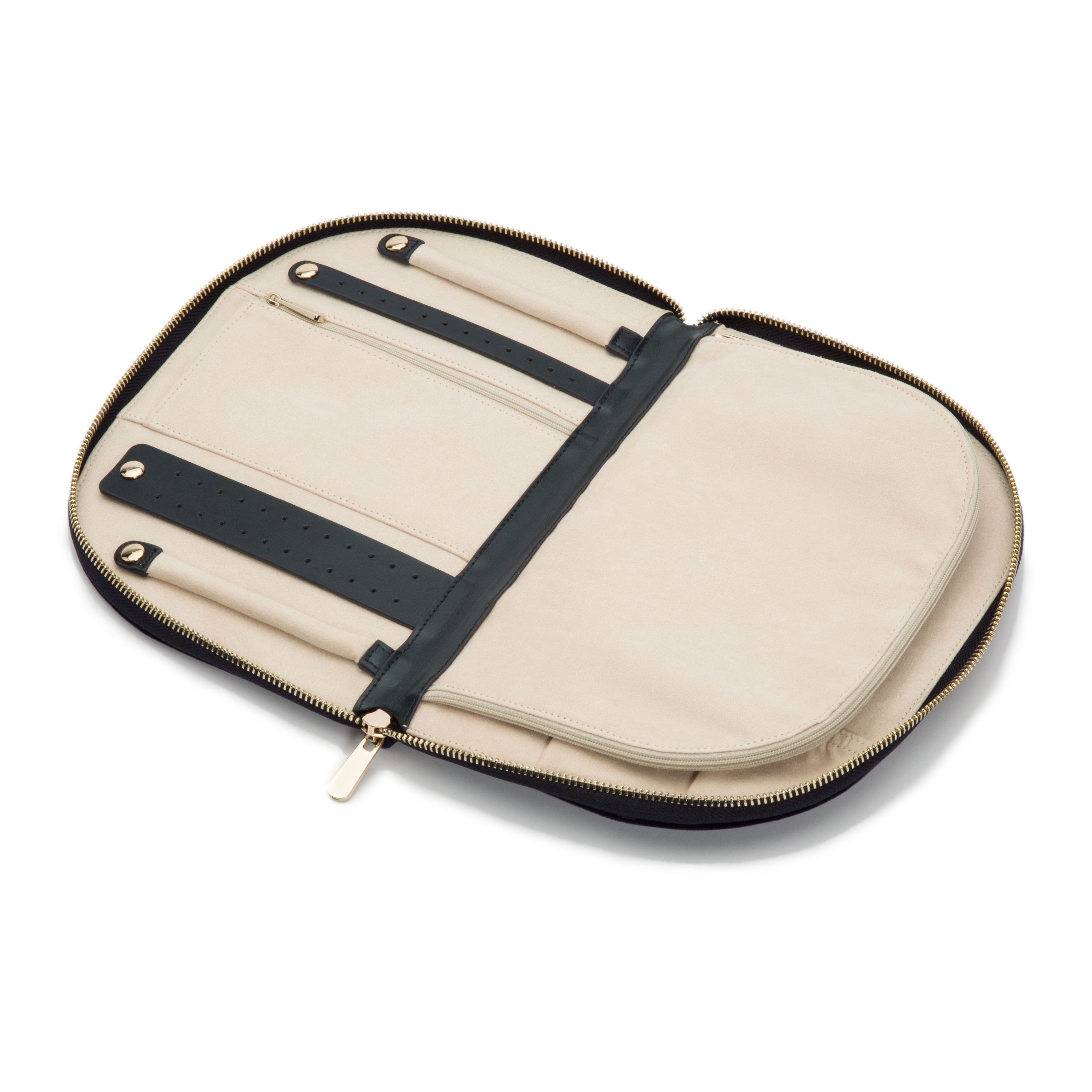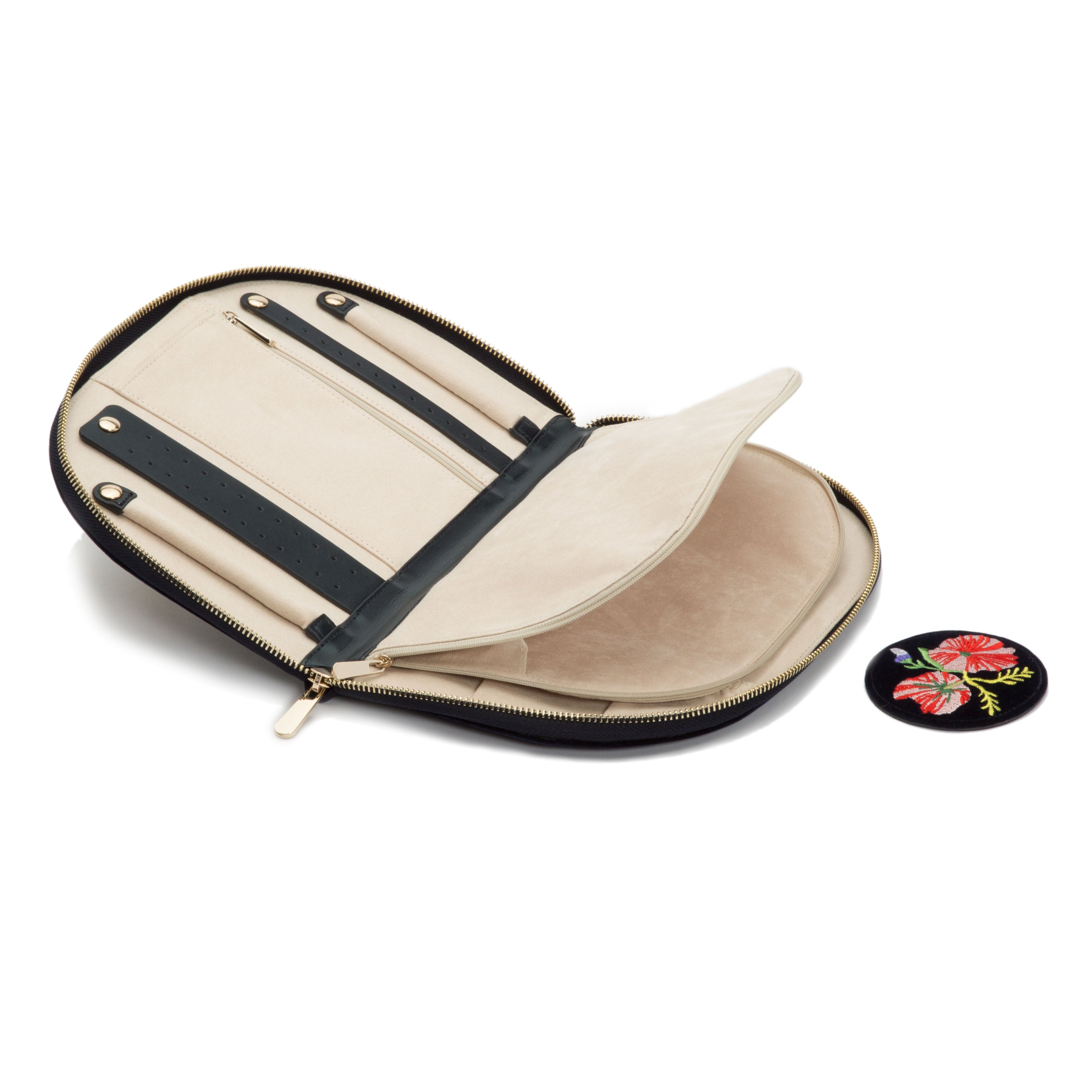- Storage: Earring holder (2), ring roll (2), zip pocket medium (1), zip pocket large (1), necklace holder (4), removable round mirror (1)