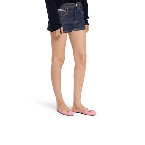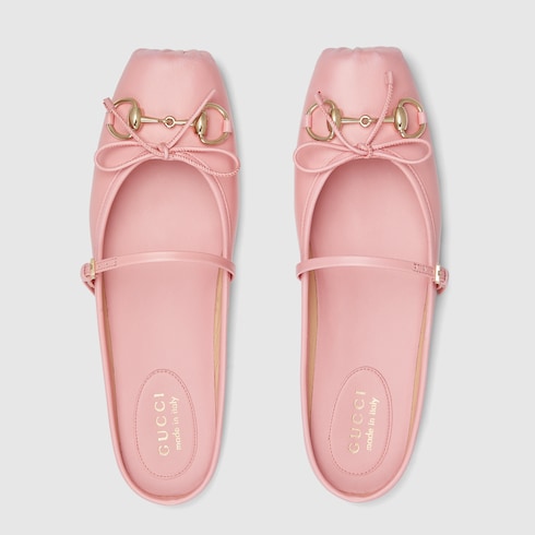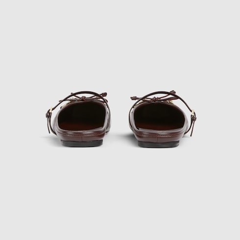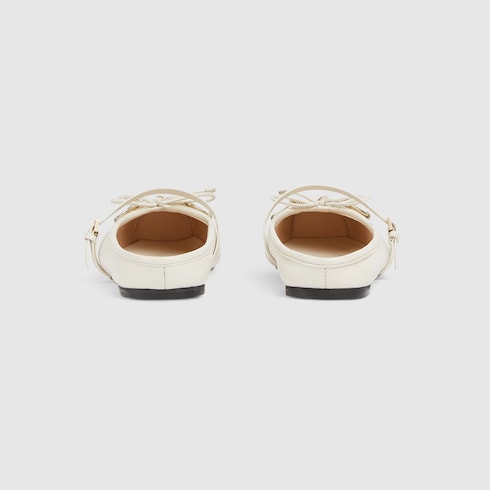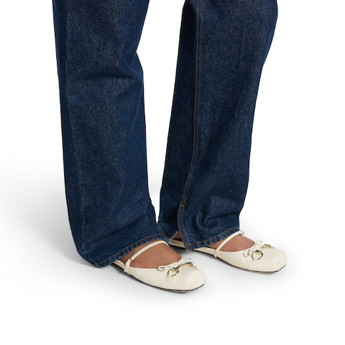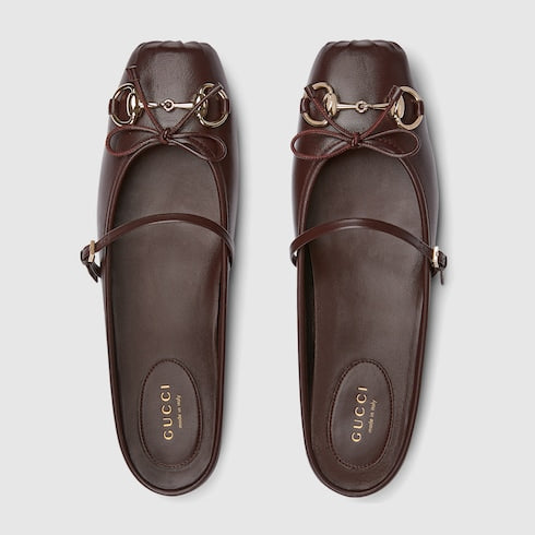 In the Fall Winter 2025 collection, this Horsebit ballet flat mule pays homage to the original ballet shoe silhouette defined by a squared tucked toe cap and the delicate bow detail. This style is crafted in leather and defined by a light gold-toned hardware. The "sacchetto" construction ensures a high level of comfort.